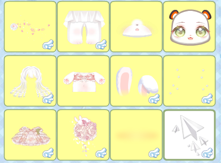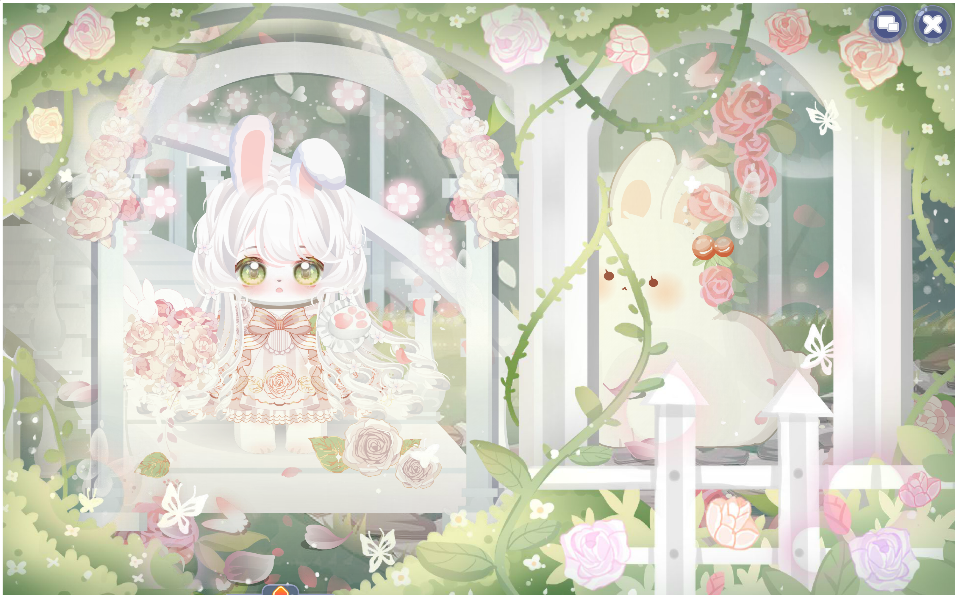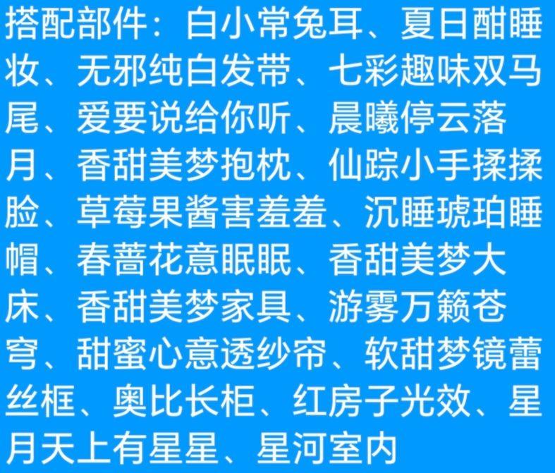 搭配部件:风眠纸飞机左袖、梦想家站姿、爱要说给你听、一路生花、芙蓉蟠璃长卷发、粉兔之家白体、庄园卖萌兔耳朵、奈奈盈粉发饰、蔷薇蕾丝花边裙、妤妤猪花束、阿芙害羞腮红、粉兔之家滤镜、粉兔之家玫瑰、秋日蝴蝶飞舞、花落铃兰花瓣、庄园深情陪伴兔、春蔷精灵降临庭、樱海约定小路、蔷薇脚边花、妤妤猪长楼梯、妤妤猪梦之庭院、妤妤猪花丛、妤妤猪花拱门、萌萌花兔光效
