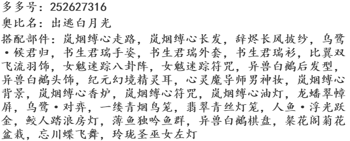 搭配部件:岚烟缚心长袍、岚烟缚心长发、诗意黛玉披风、诗意黛玉长裙、诗意黛玉阅读、诗意黛玉耳饰、诗意黛玉头饰、悲戚徐夫人斗笠、悲戚徐夫人泣妆、夏.王子亲昵