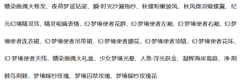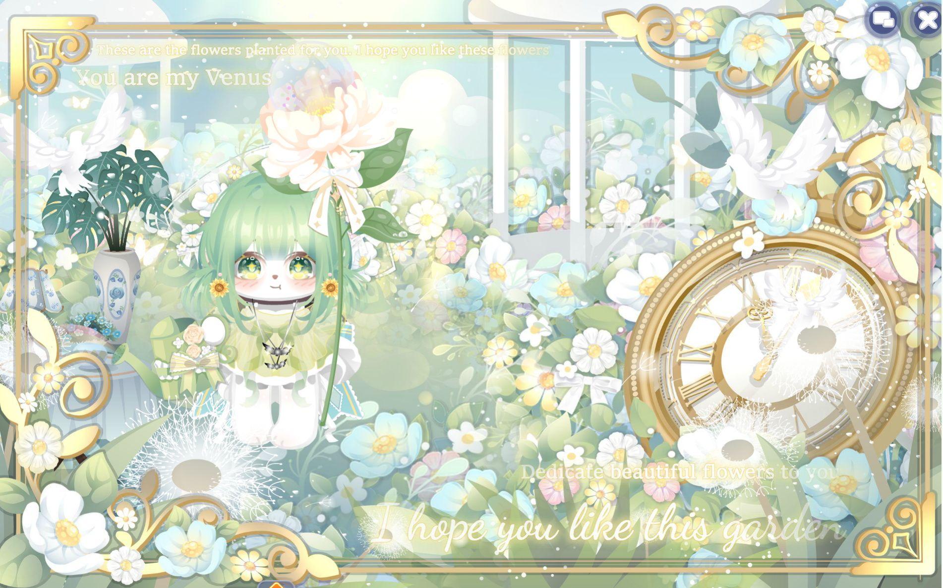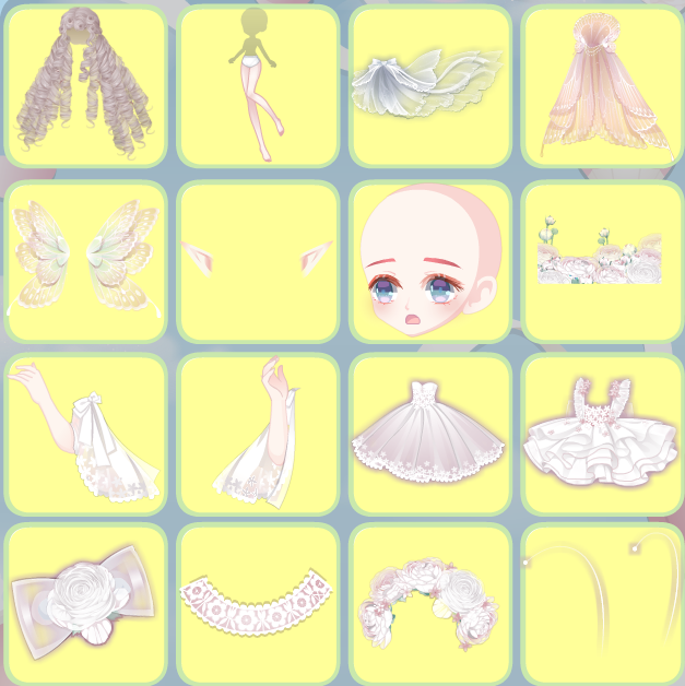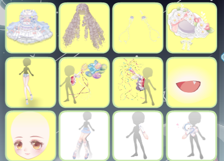 搭配部件:糖染画偶小短裙,糖染画偶大卷发,糖染画偶大发带,浮花茶话会帽子,梦境拼图鞋子,室女·气球,室女·彩带,生之礼赞开心笑,时光精灵微笑妆,室女·烘焙,室女·小屋,室女·牵情,室女·庆典,落樱阳光洒落