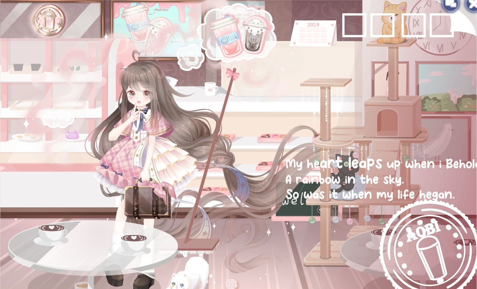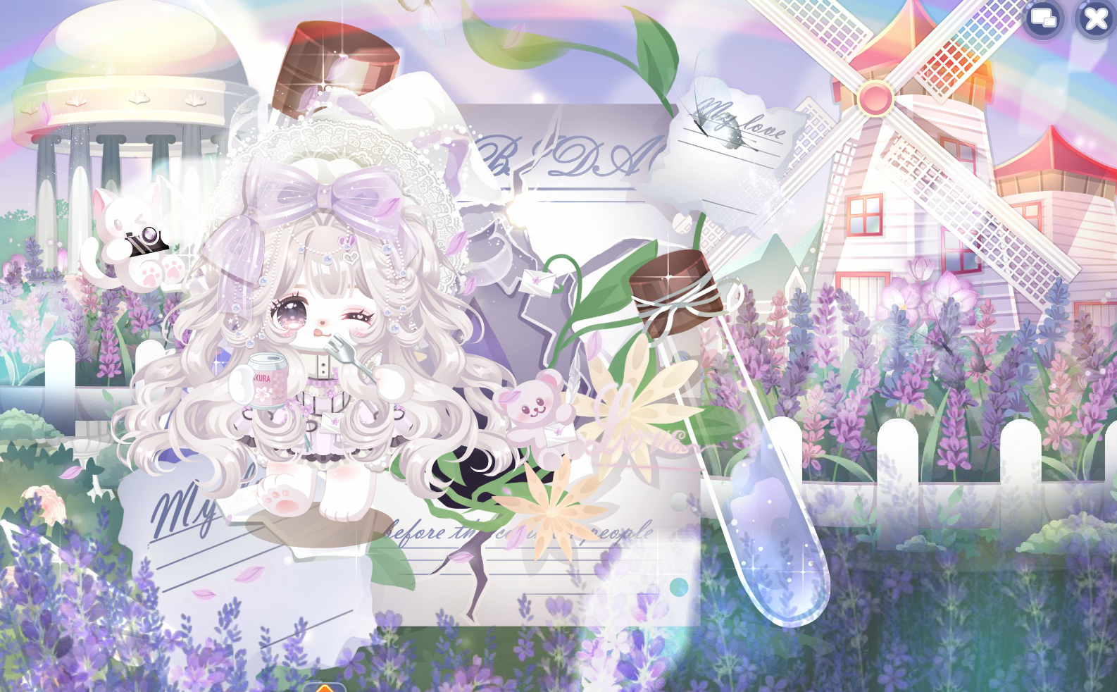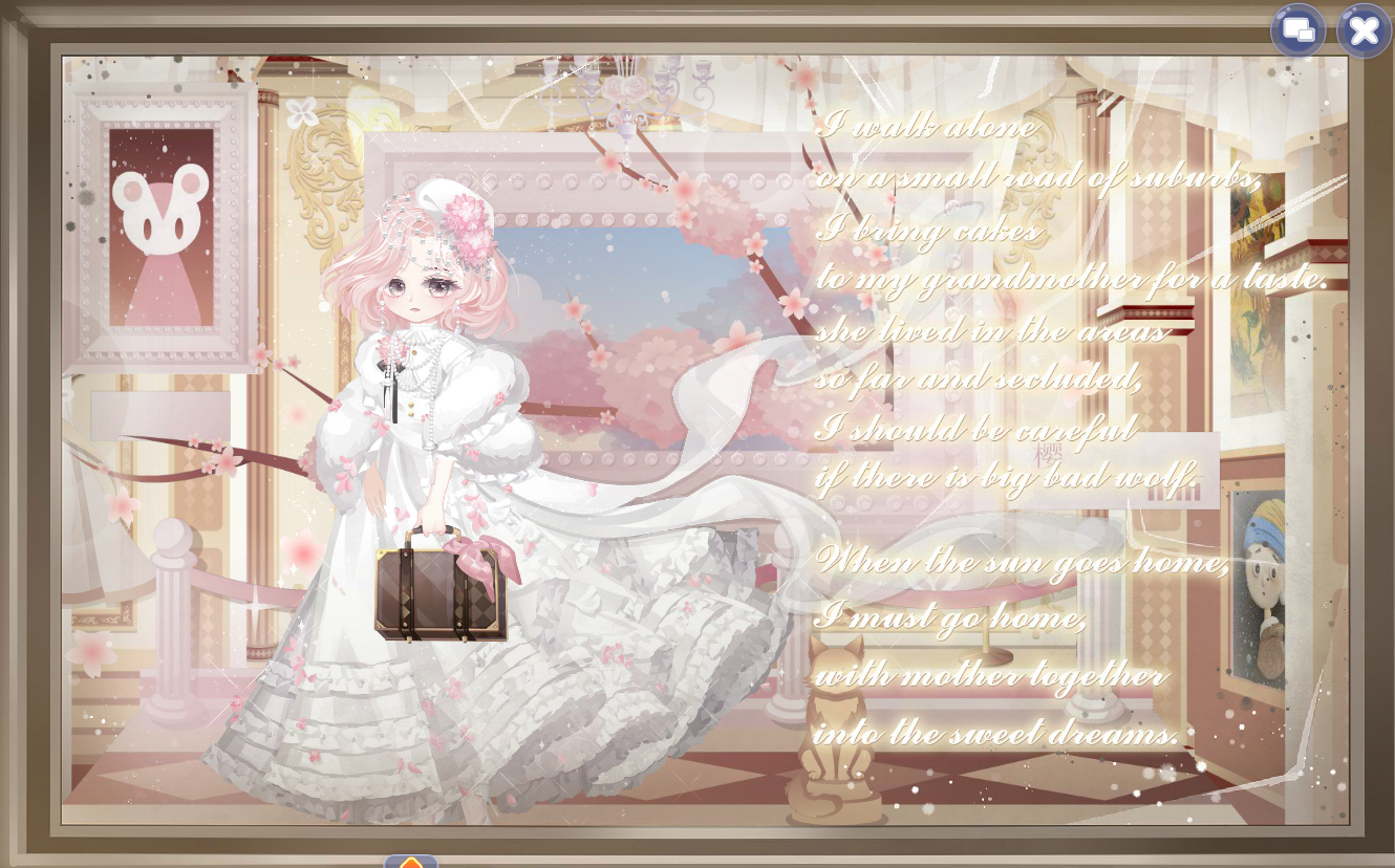 搭配部件:拂风留学归、过冬日常堆堆袜、回忆书半藏妆、迷兔趣游双辫发、春日学生小披肩、春日学生蓬蓬裙、蝶影抚唇、纯真花少女头饰、钟情空想声乐家、钟情明信星河志、钟情念想奶茶杯、波斯忆梦萌小猫、温馨猫爬架、猫与女仆咖啡厅