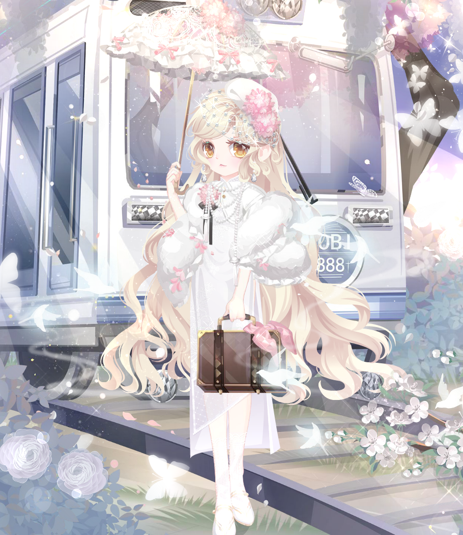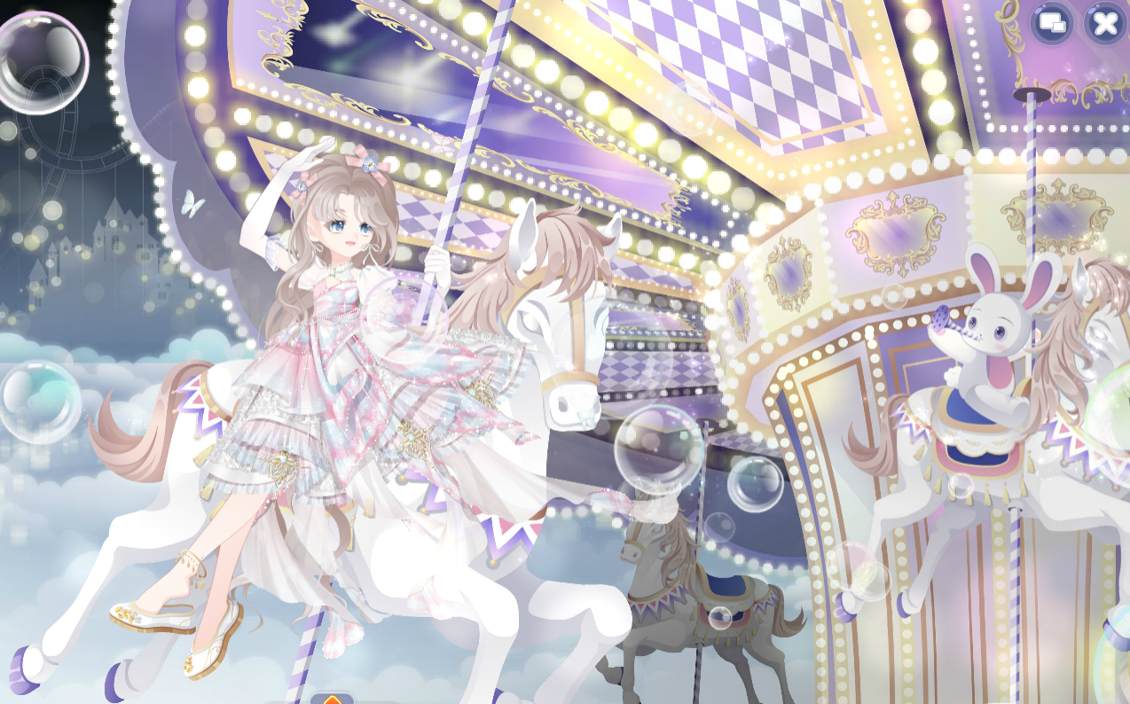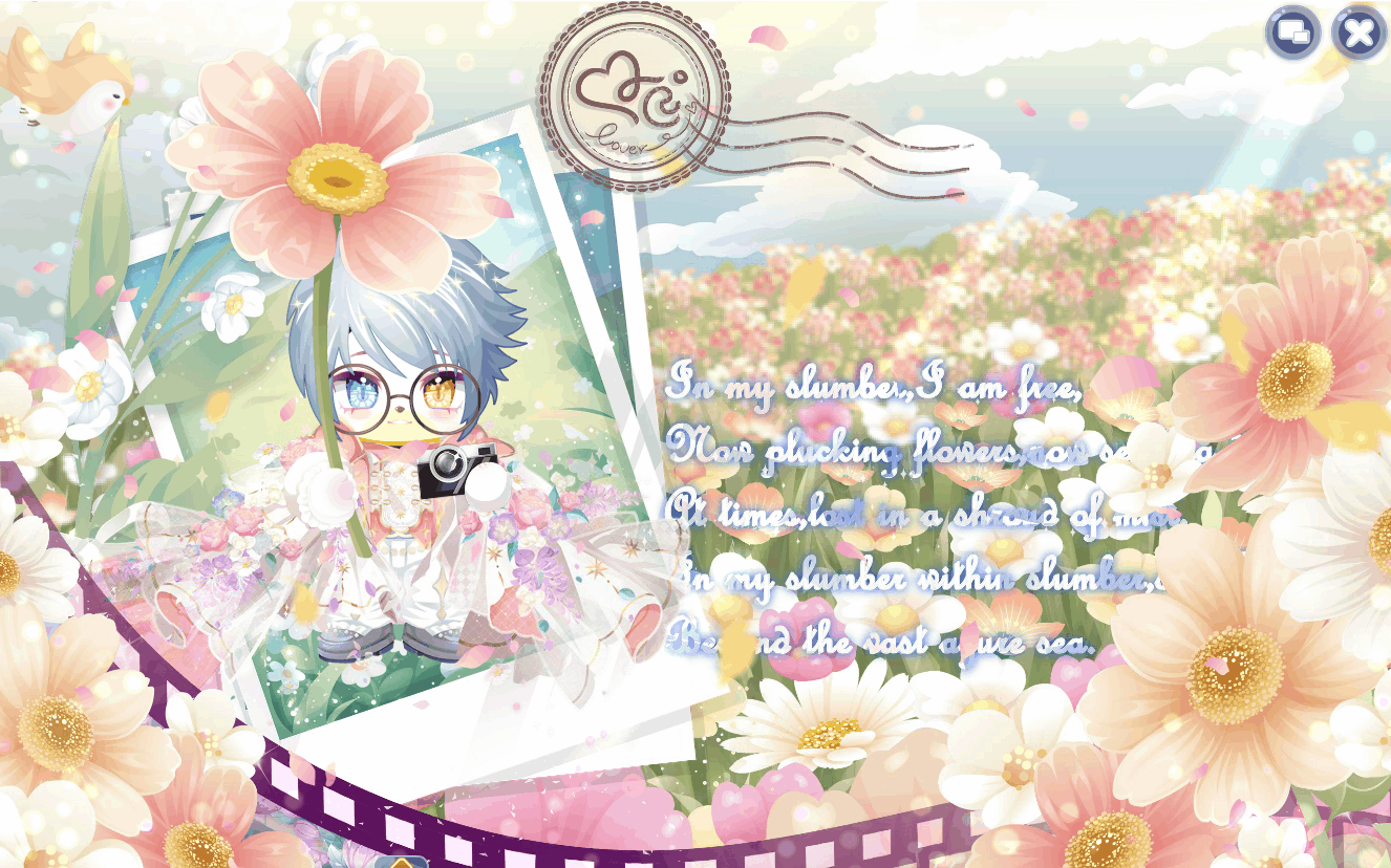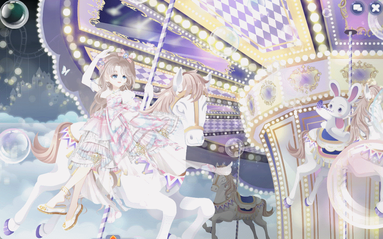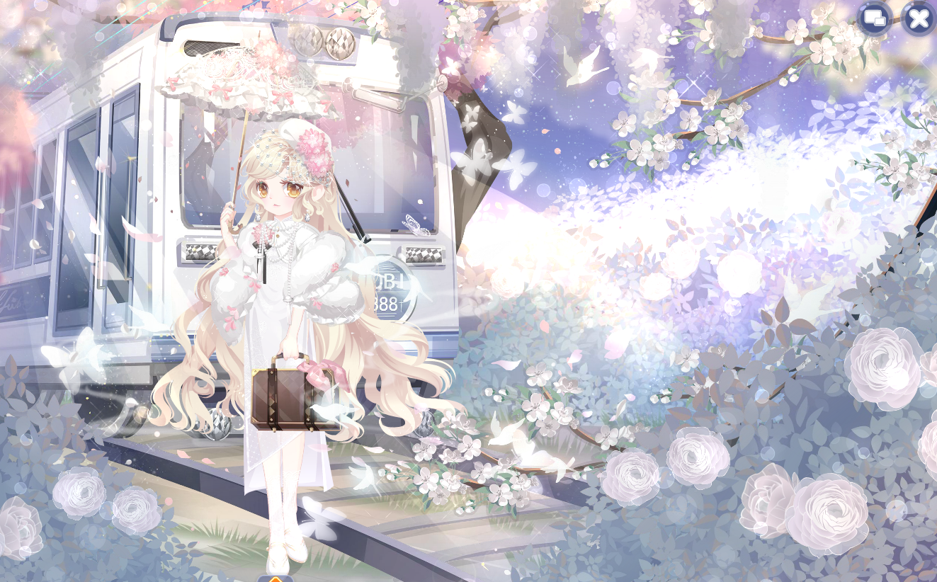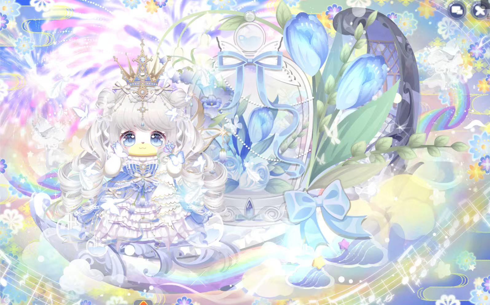 搭配部件:周年庆典站姿、周年庆典花篮、周年庆典发夹、甜云暖光挎包、童话故事表情、