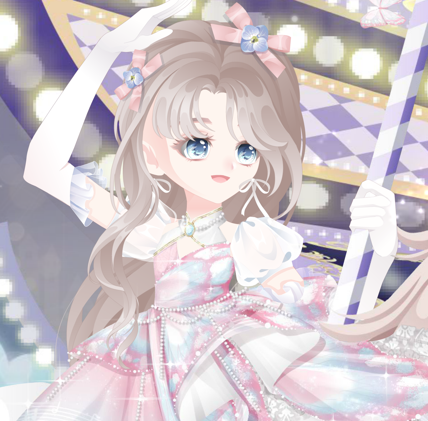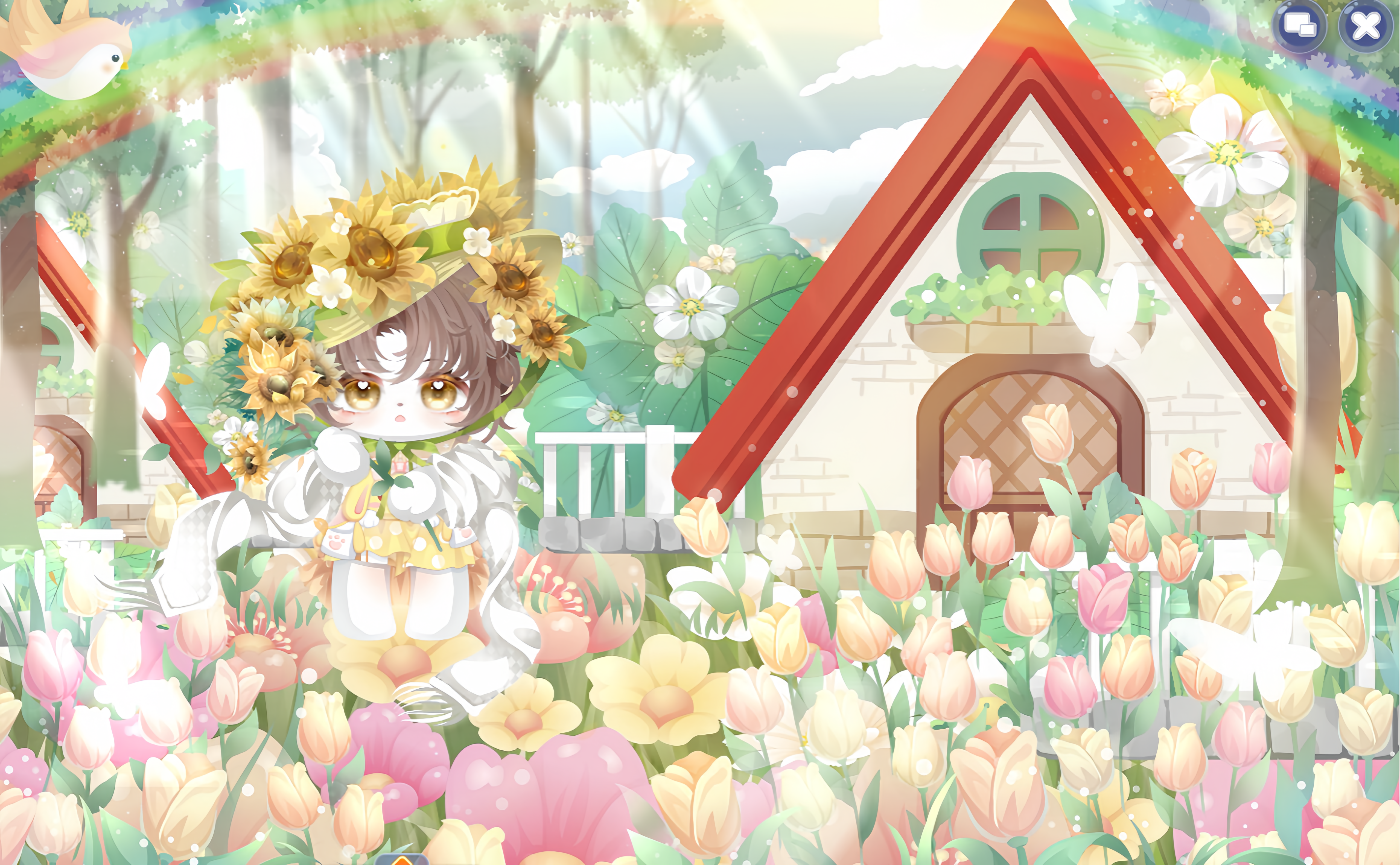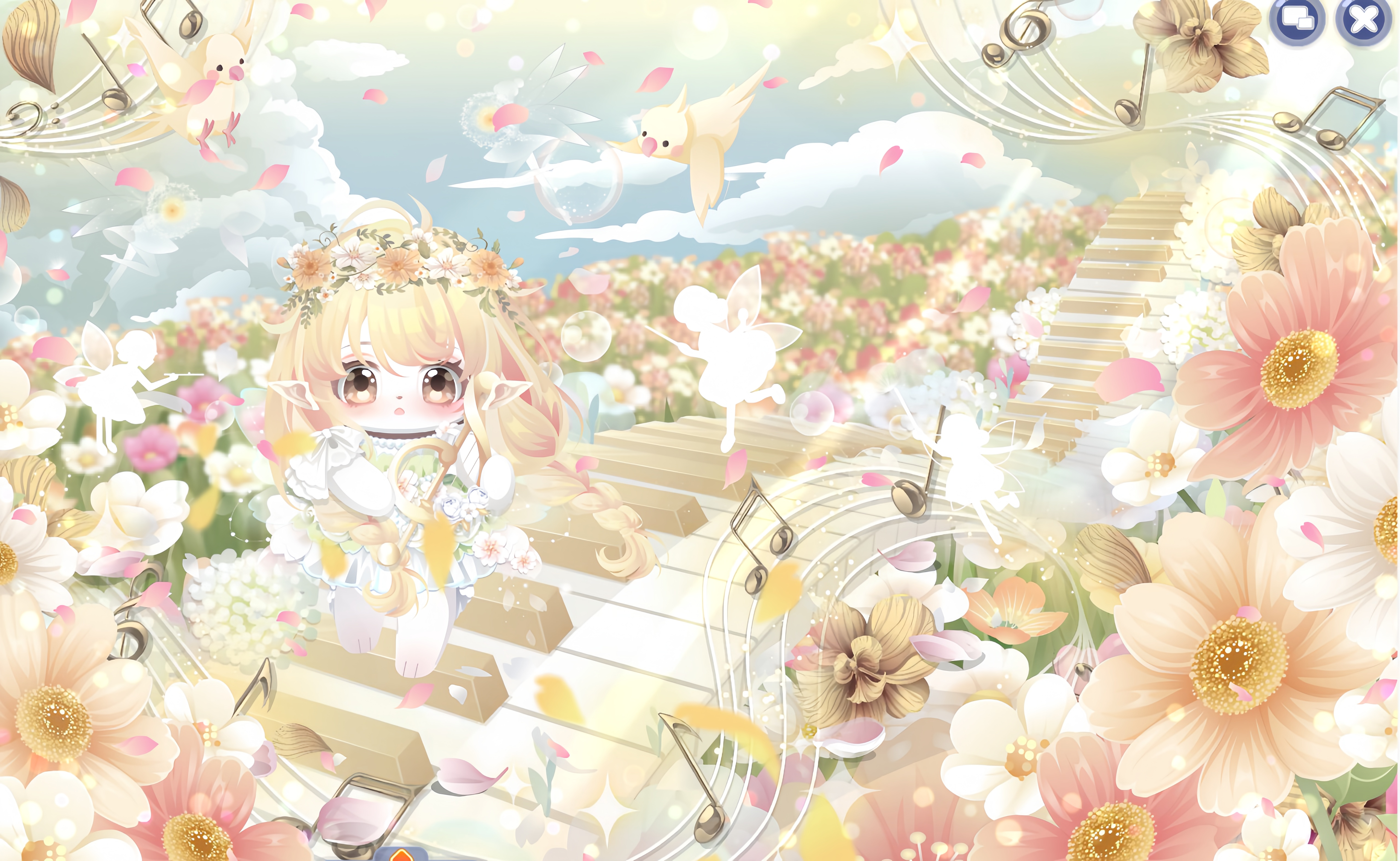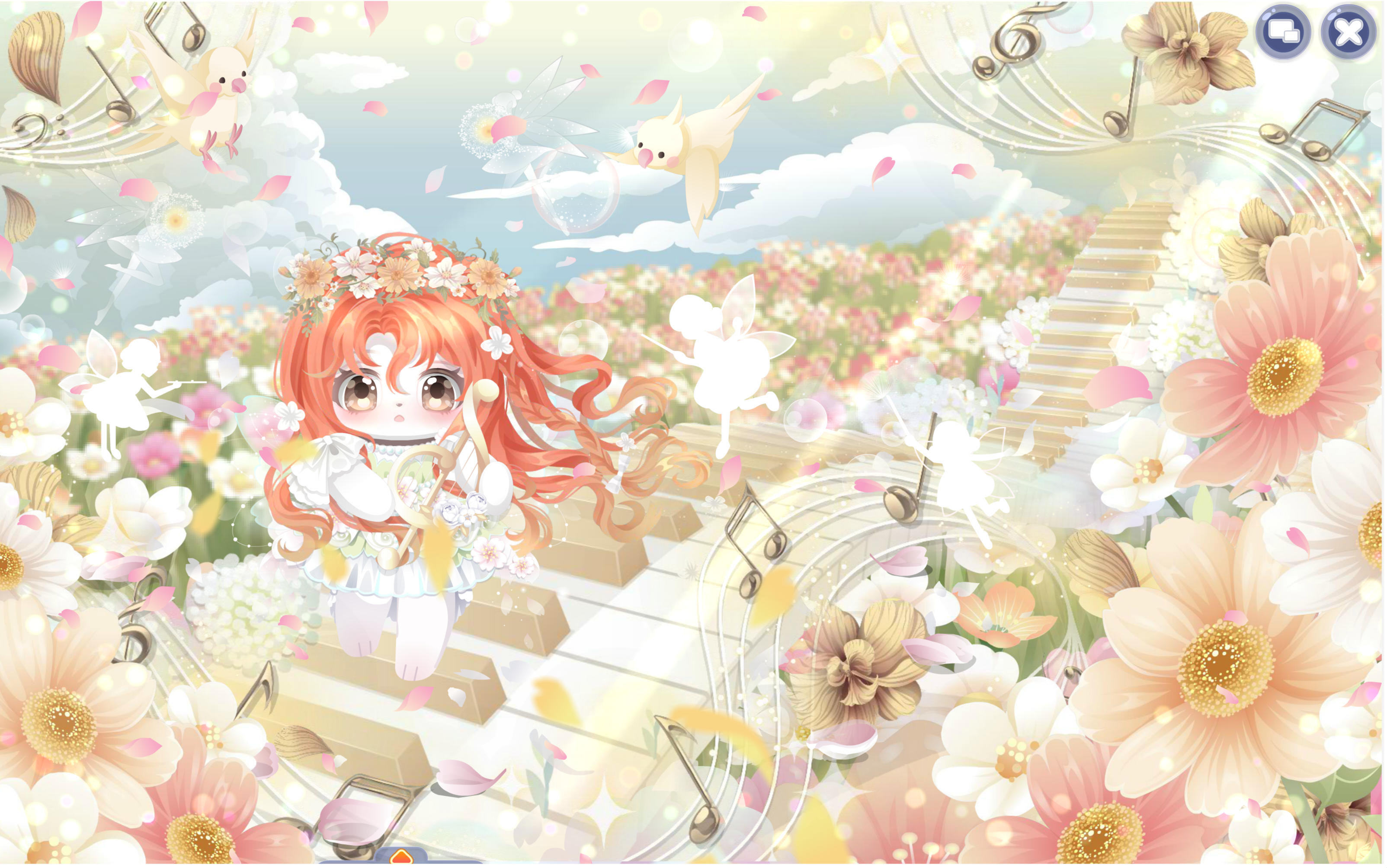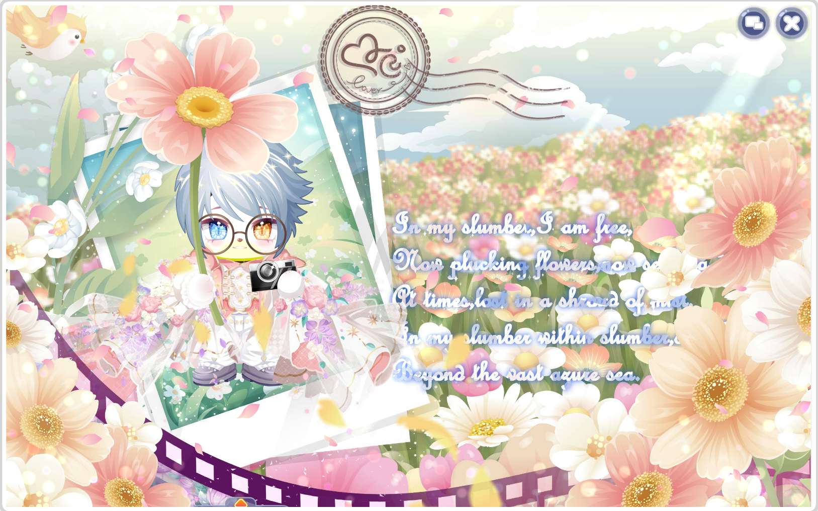 搭配部件:周年庆典站姿、周年庆典花篮、周年庆典发夹、甜云暖光挎包、童话故事表情、