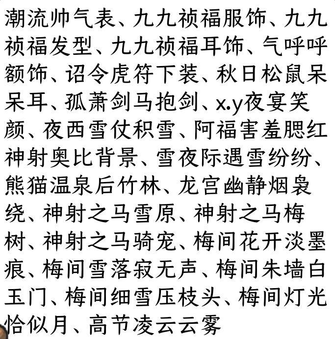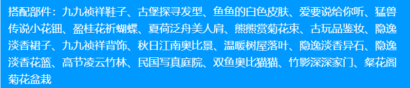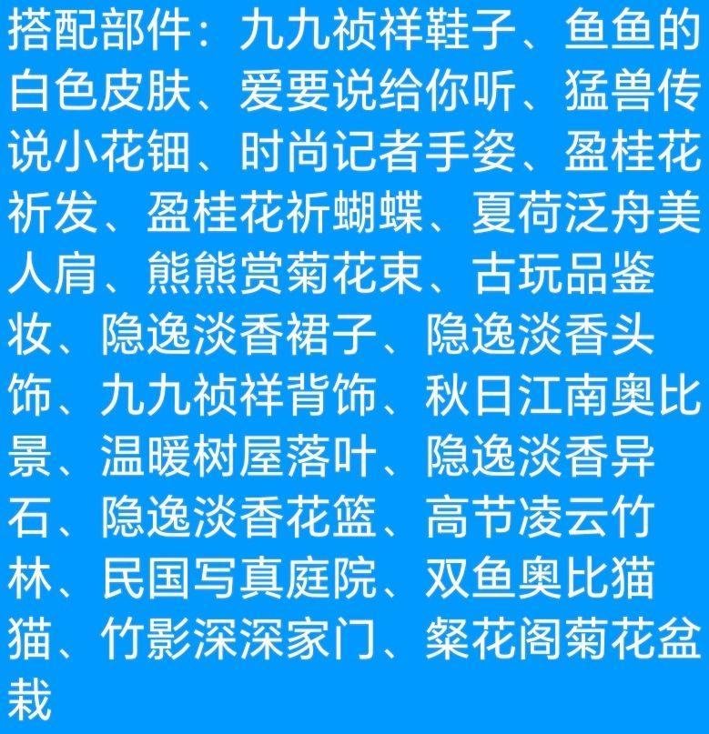 九九祯祥左袖,九九祯祥右袖,恋爱空间腿姿,礼盒甜心马尾,母爱挚爱发簪,沉睡琥珀睡妆,元旦小厨娘耳环,古老祖先自然饰,元宵烟花裙,阿芙害羞腮红