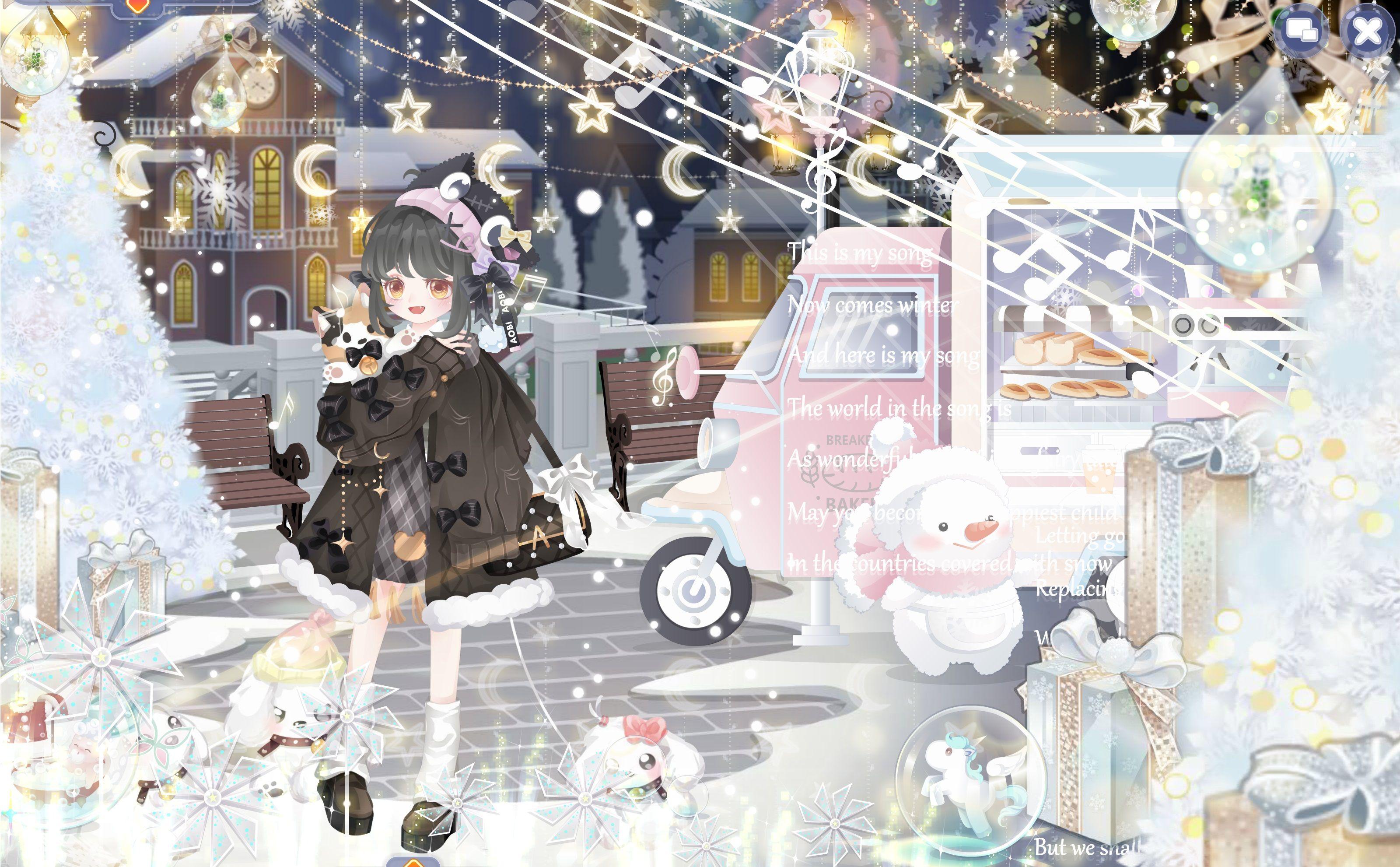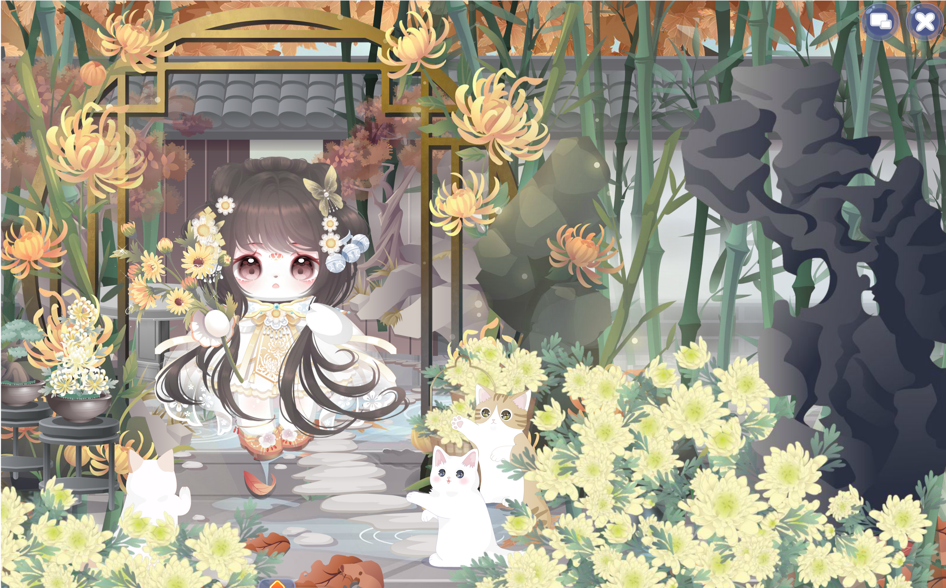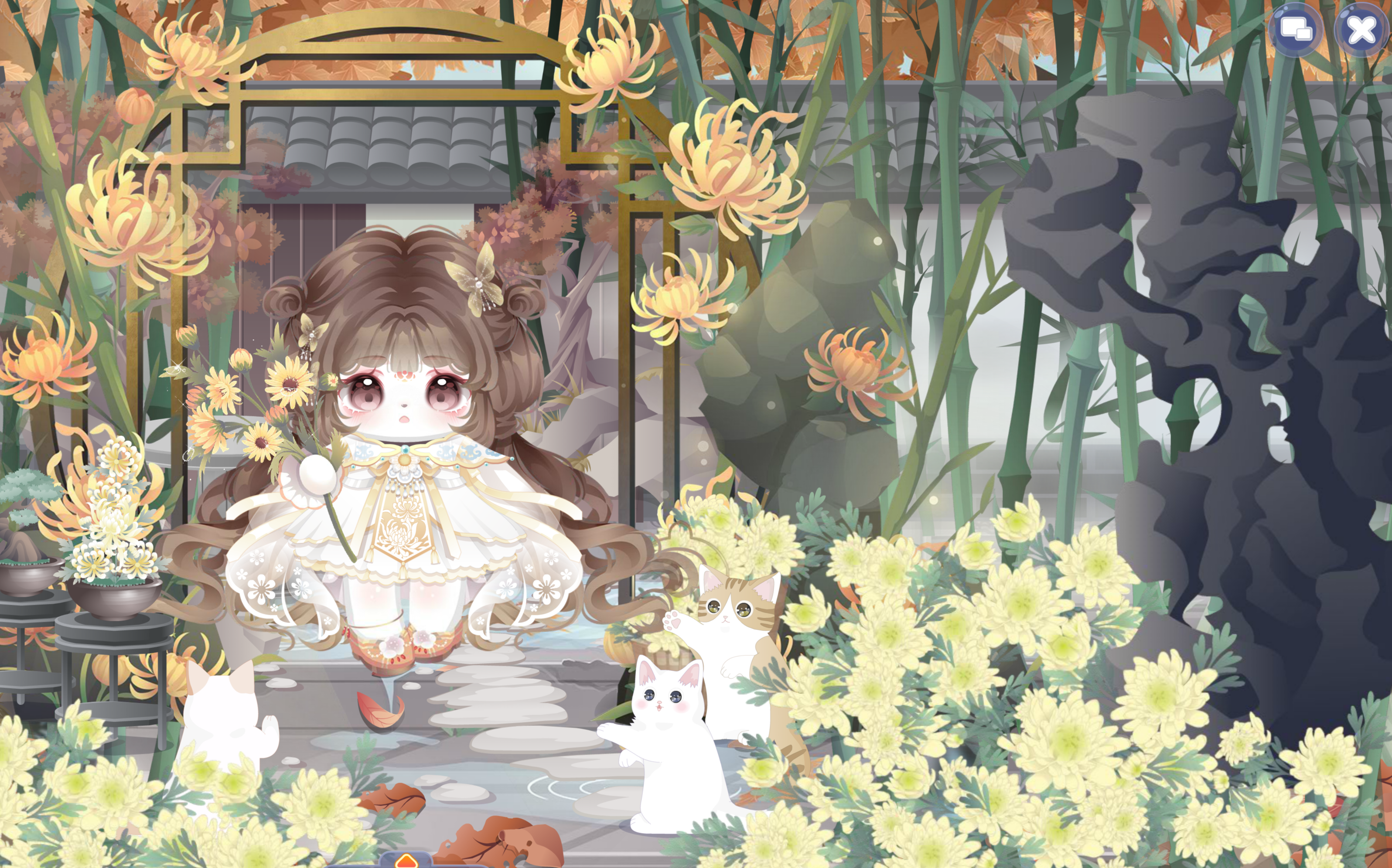 懵懂颜,醉花阴长裙,醉花阴外披,雪花飞舞,温柔妆容腮红,H.X清桂花帽子,摇船浮语枫叶,摇船浮语背景,枫歌秋笺银杏,挽月洒满星辰,挽月流云,墨韵画境卷轴,墨韵画境掌控,缘侧之宿小雨