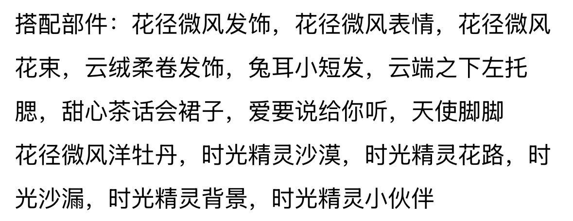 搭配部件:花径微风发饰,风眠纸飞机手持,甜梦恋语蝴蝶结,童话故事公仔,童话故事裙子,猛兽传说小脚丫,绿熊冰淇淋颜,绿熊随风飘发,韶光·缚蝶,韶光·听风,花径微风洋牡丹,月桂雅境边框,信使·幻想庄园,信使·花瓣散落,云笺纸飞机彩虹,绿熊郁金香花丛,绿熊魔法诗句,绿熊脚边修勾