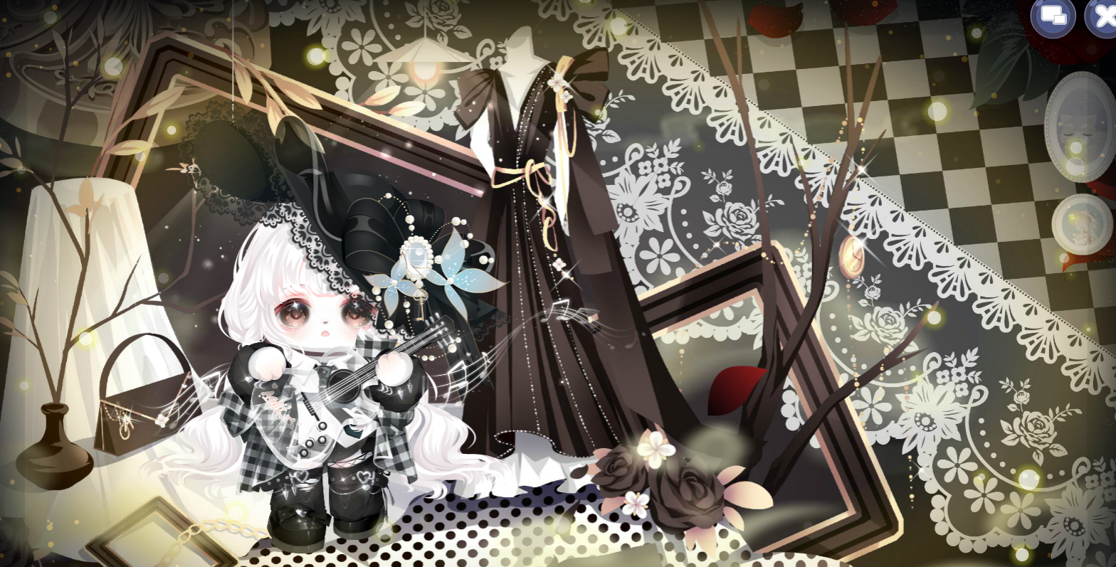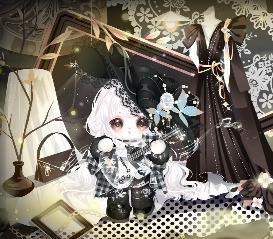 搭配部件:冬意融融发、星奥学院左袖、星奥学院魔杖、陌·留白、艺术畅享短裙、流梦巨蟹额饰、流梦巨蟹头饰、纯享站姿、薰衣花嫁蝴蝶结、香薰缥缈帷幔、香薰月明如水、风信子千层花帘、月华无边境界、月华仙客共舞、奇遇时空精灵、全篇魔力纯黑景、洛水之神幻蝶、花嫁薰衣草
