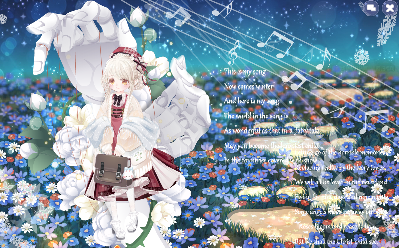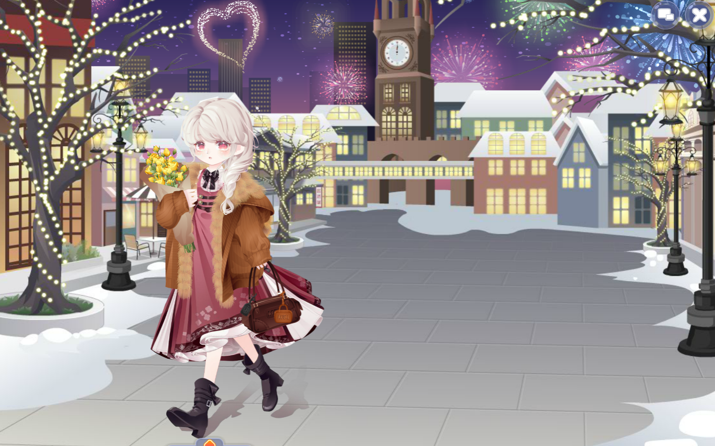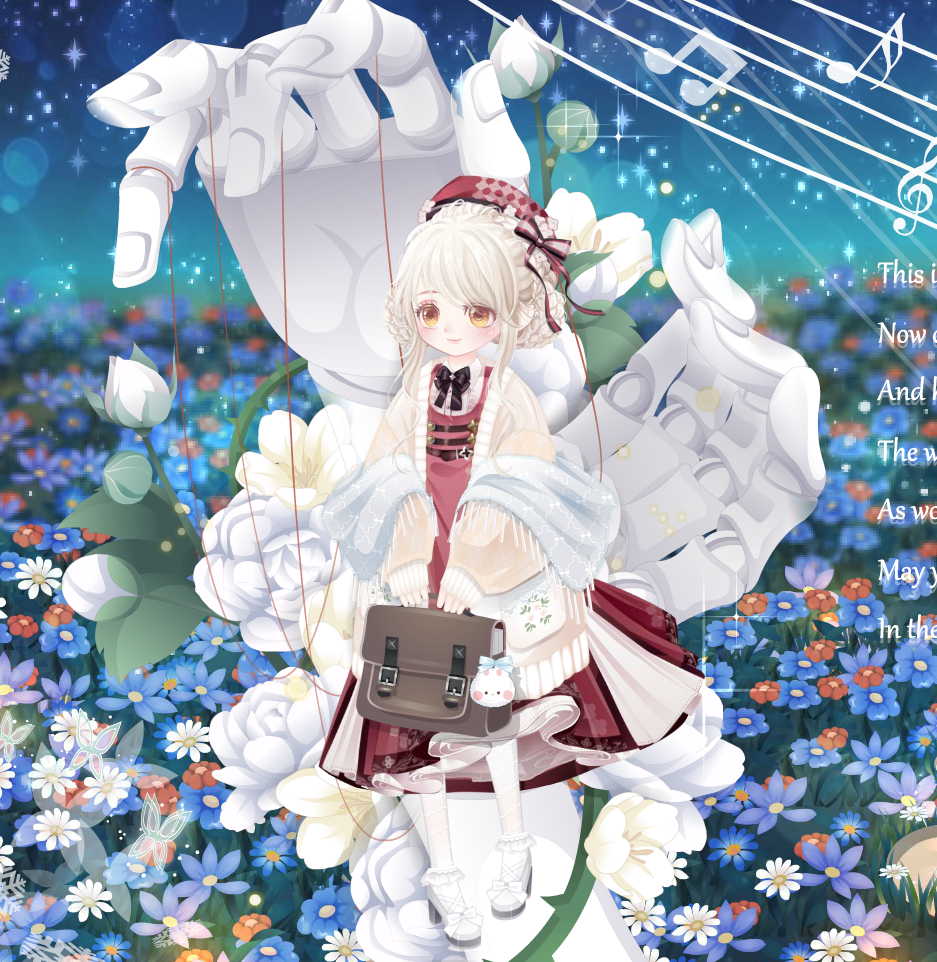 搭配部件:伦敦街头裙子,伦敦街头帽子,文艺校园外套,金色年华盘发,宫廷少女站姿,鬼娃木偶操纵,时光精灵微笑妆,猫猫礼遇背景,雪之歌框架。