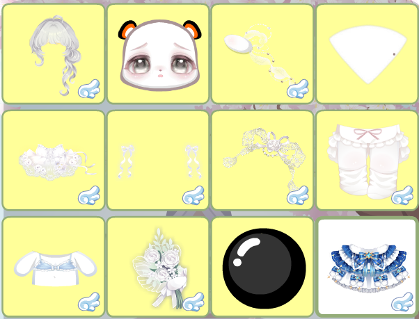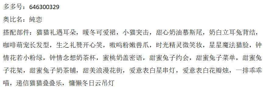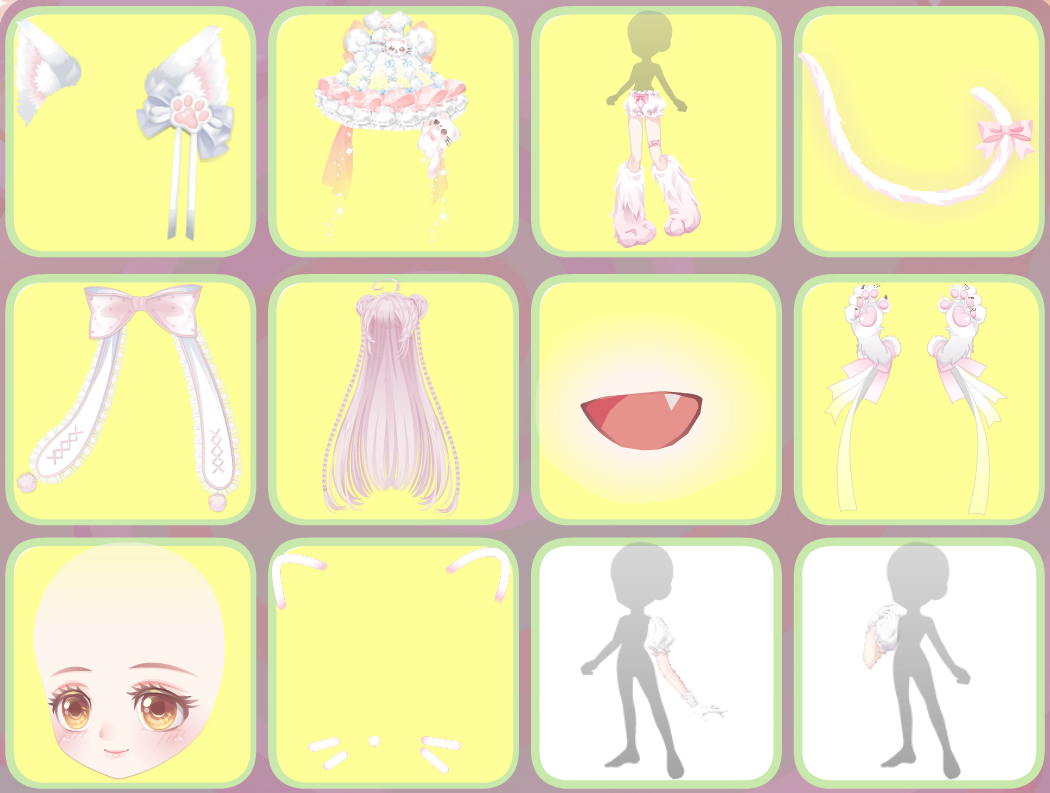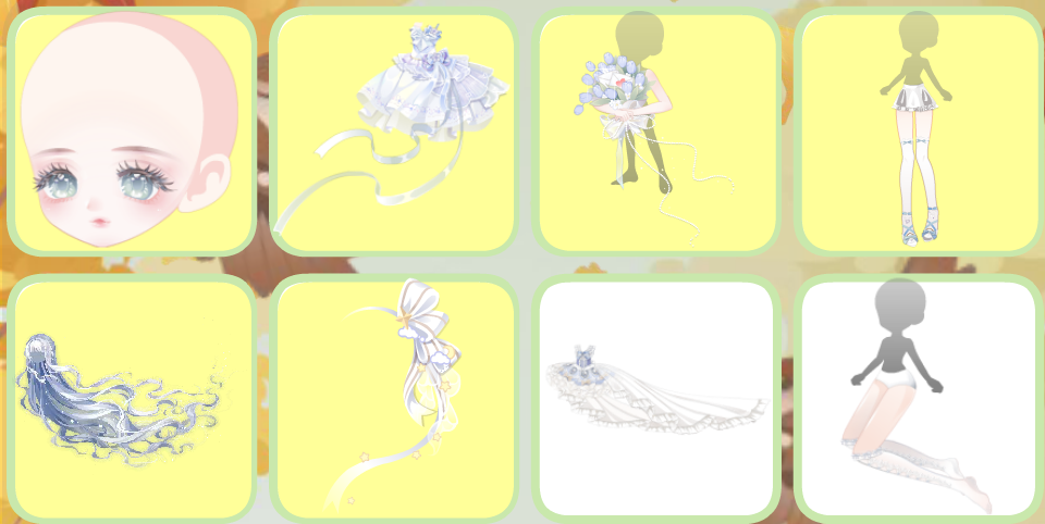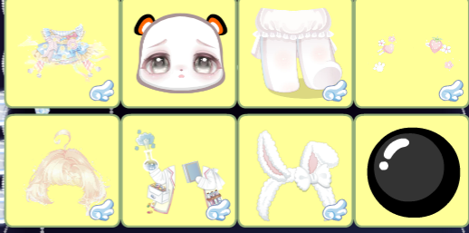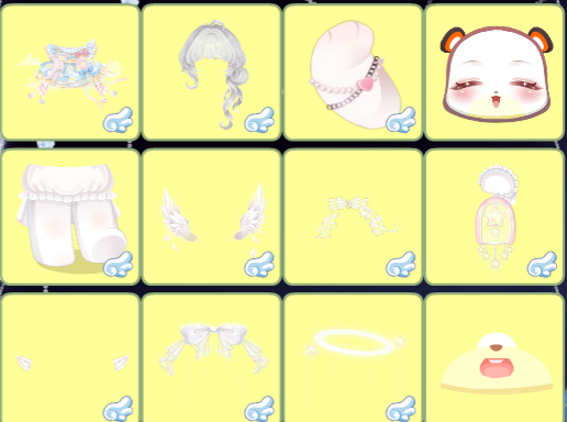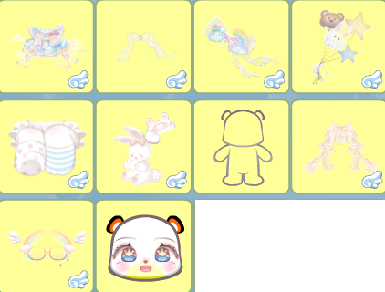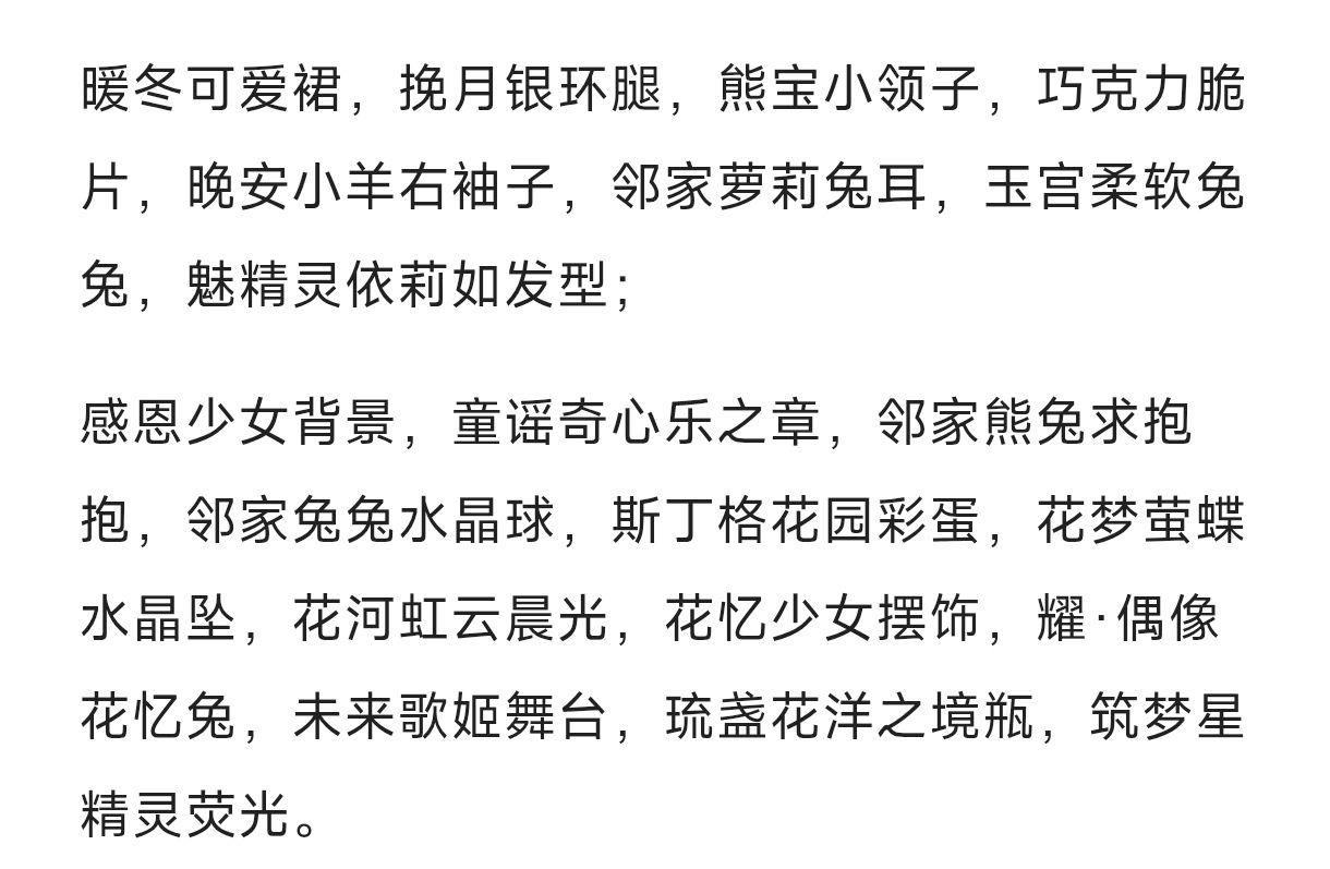 糖果梦幻裙、守护星愿裙纱、云笺纸飞机发饰、乐园迷藏气球、鱼鱼的摸鱼胖腿、蜜桃烤奶手持、奥比灰萌皮、熊熊奶油卷、萌趣乐园眼镜、春田花花萌男妆、