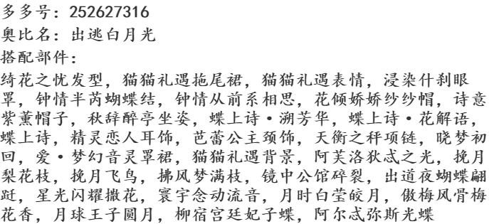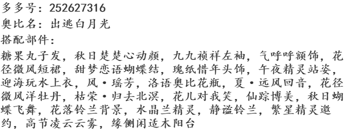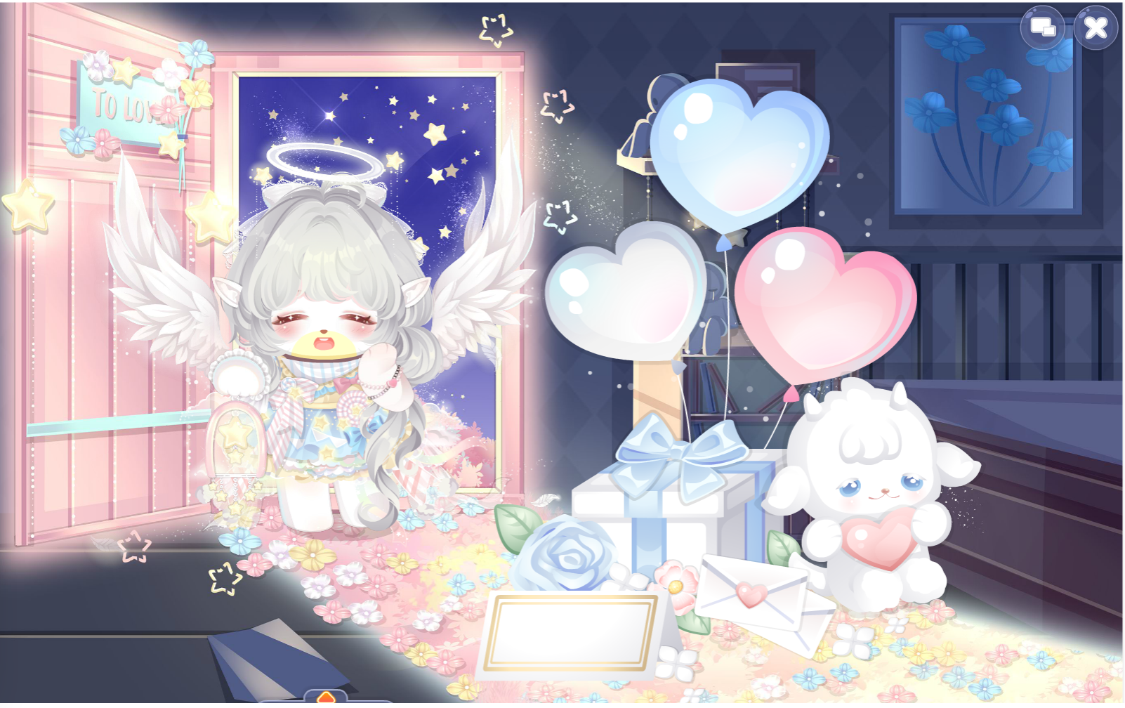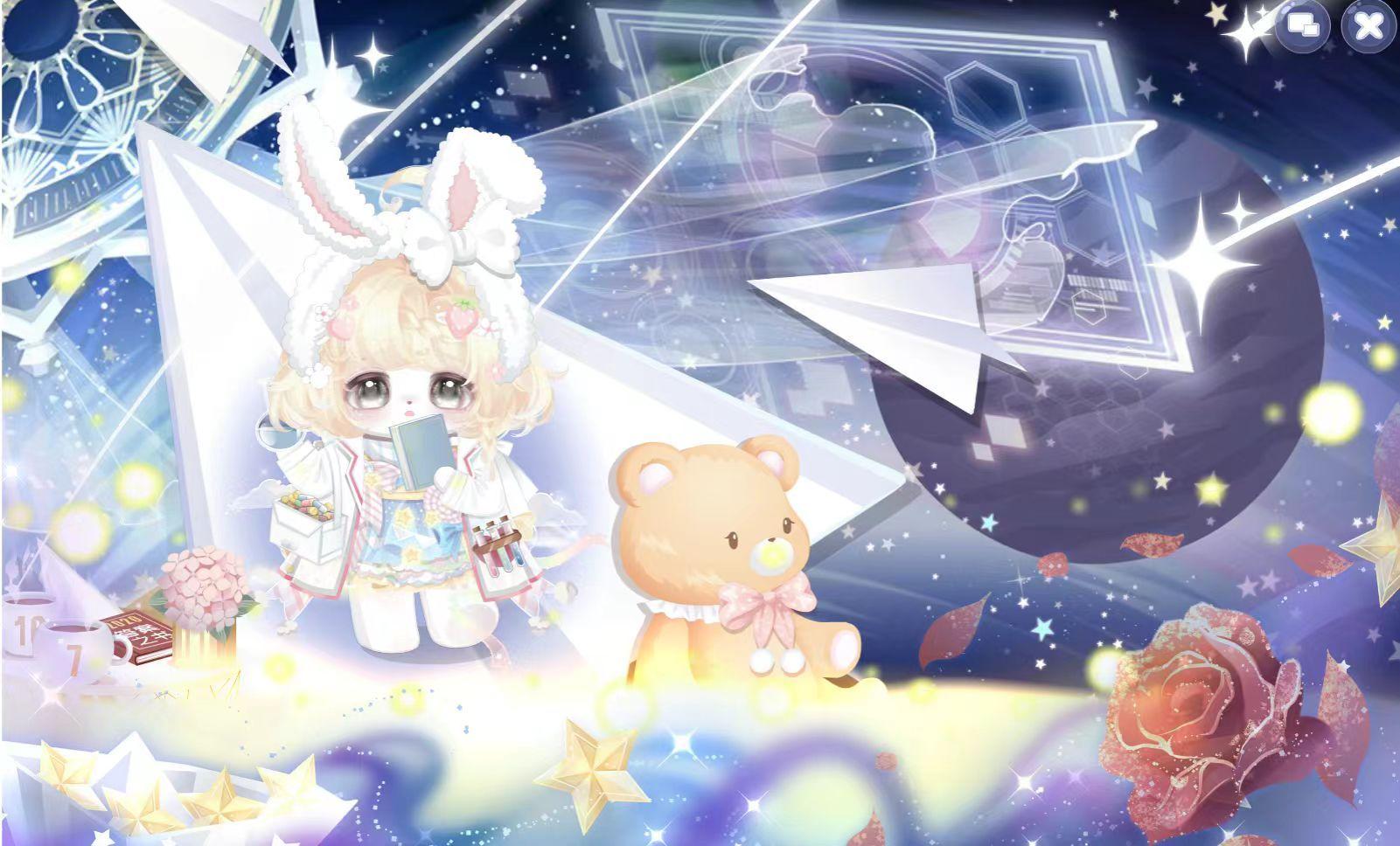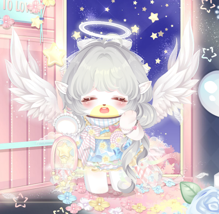 搭配部件:糖果梦幻裙、糖果丸子头、粉迎嬉乐左袖、粉迎嬉乐表情、守护星愿站姿、守护星愿羽翼、守护星愿裙纱、守护星愿星星灯、守护星愿耳朵、守护星愿头饰、守护星愿光环、小王子温柔笑、守护星愿任意门、甜梦恋语情书