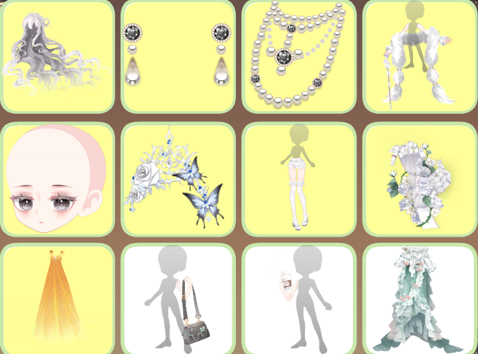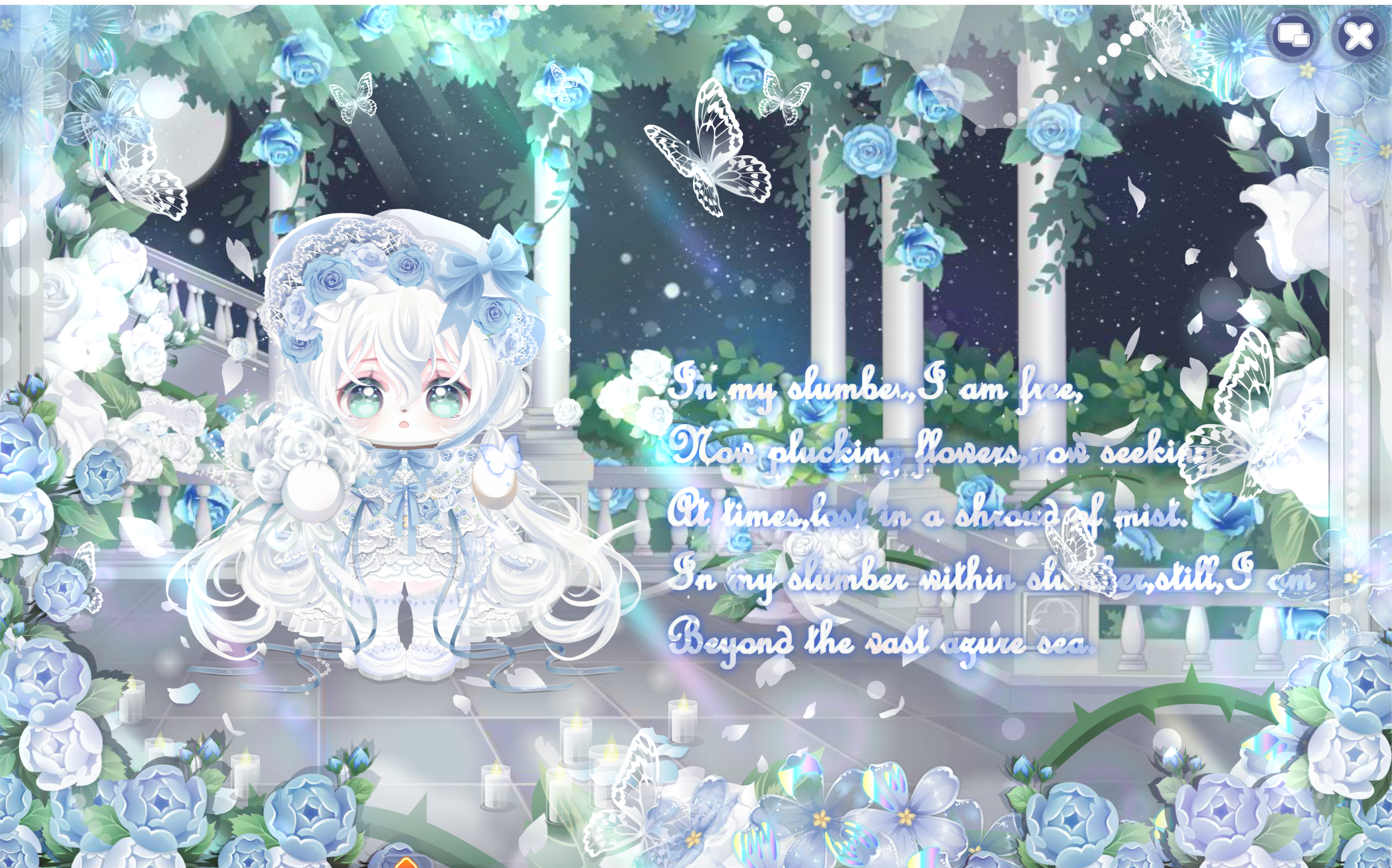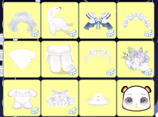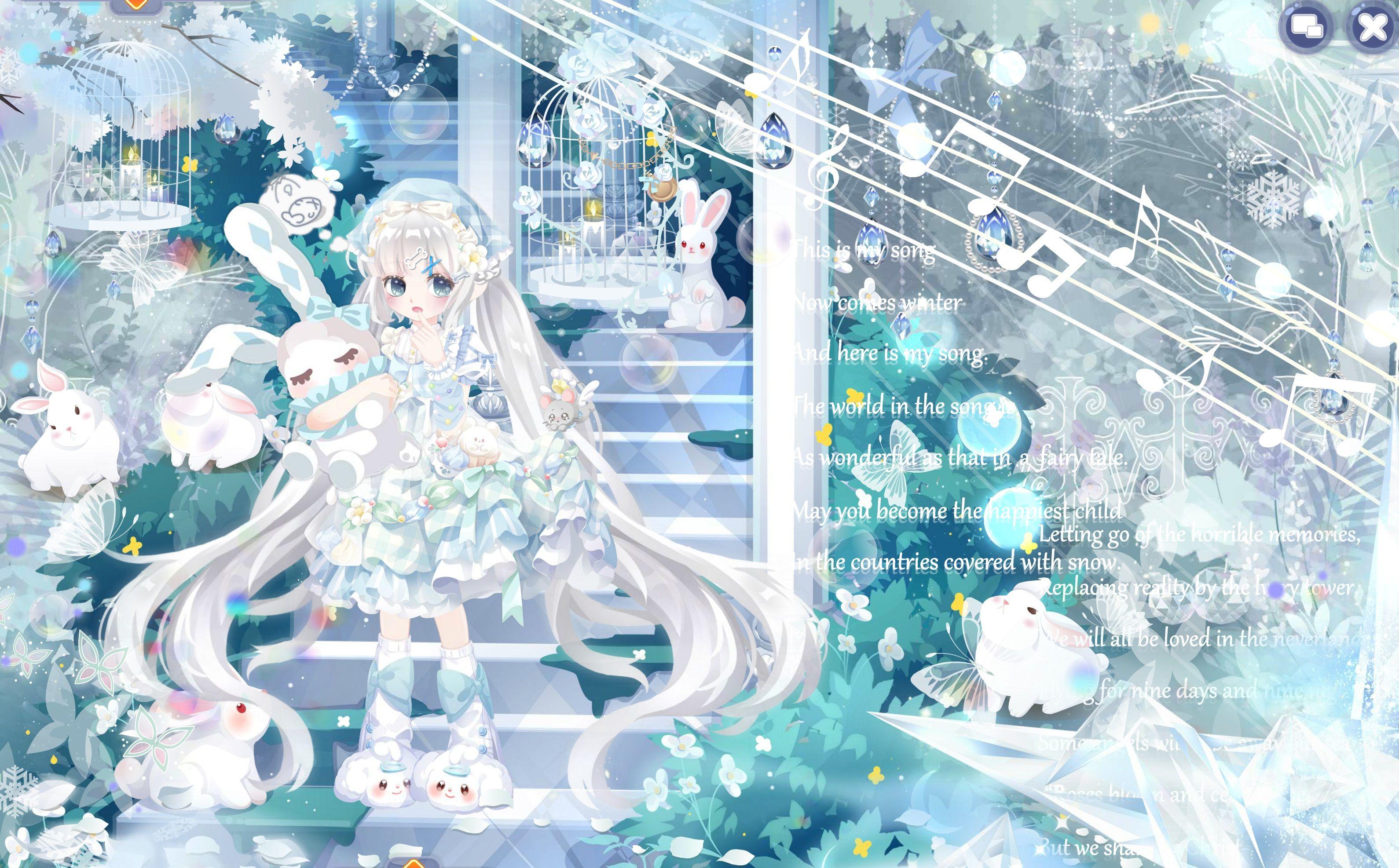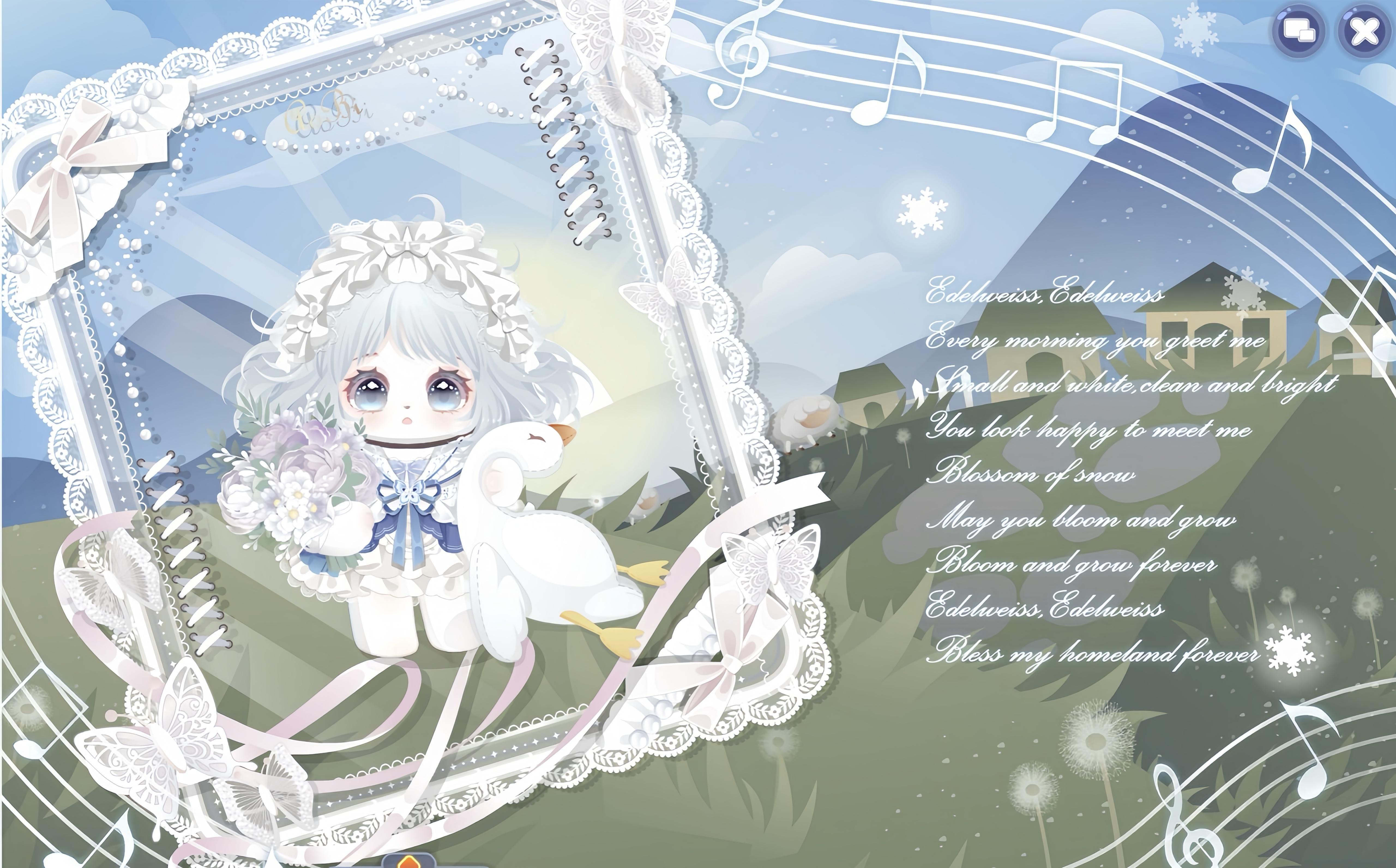 搭配部件:纯白战争发型、纯白战争鸭子、练习书法外套、云朵旋律发饰、气呼呼额饰、守护星愿站姿、守护星愿头饰、花径微风花束、鱼鱼的白皮肤、鱼鱼的蝴蝶内裙、爱要说给你听、风·妙瞬,霜糖丸子相框、雪国列车童谣、田野小画家背景