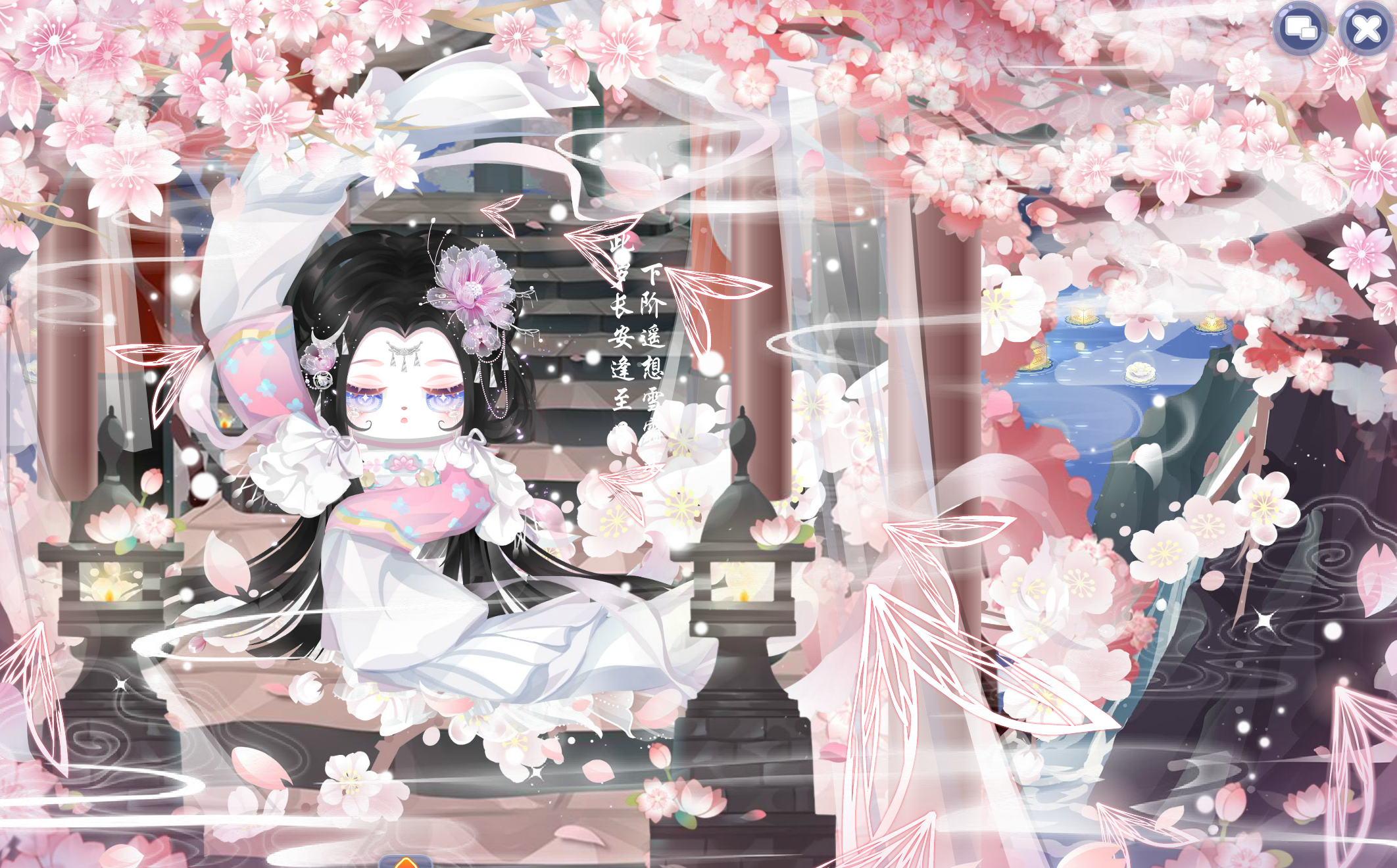 樱花、月绫青衣花钿、月绫青衣裙、彼岸霜华若绸、花漾幻庭丸子卷、病系天(pbc)使腮红、鱼鱼的白色皮肤、芙蓉蟠璃头饰、奥比白萌皮、萌萌桃夭手持、诺·知音郡主坠饰、