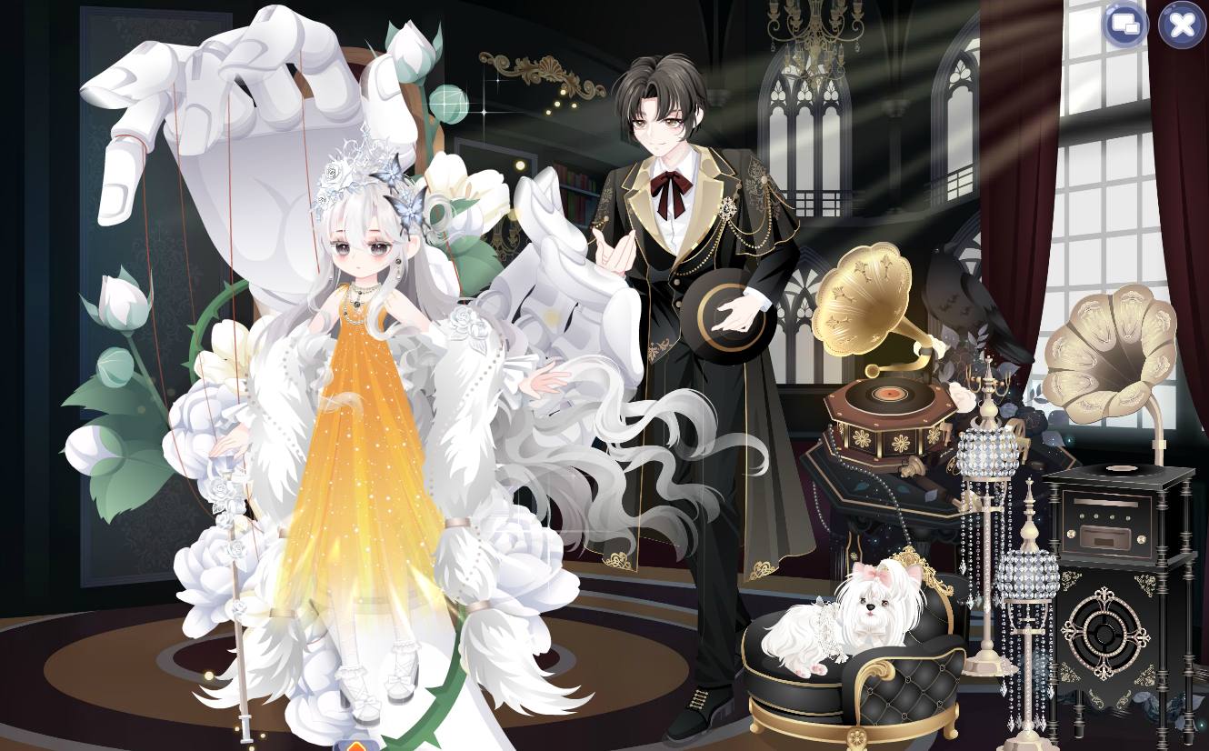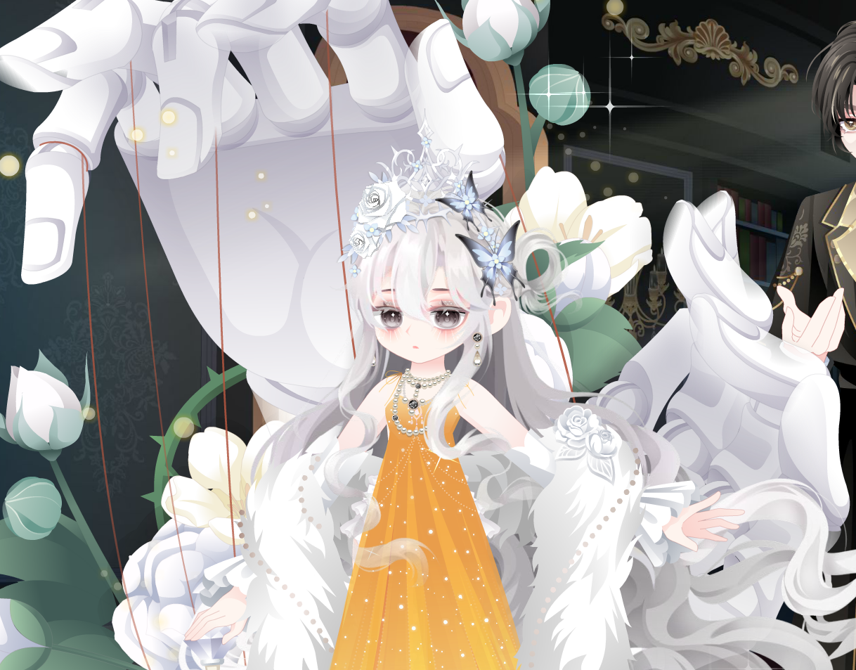 搭配部件:初岁银纱卷发,夜冕绘梦耳坠,夜冕绘梦珠链,极夜银谕袖,浮世献歌妆,荆棘韧生花冠,宫廷少女站姿,鬼娃木偶操纵,周刊名人。留声萦年留声机,絮语萦年绅士,乌鸷弥城边几,梵享奢藏博物馆。