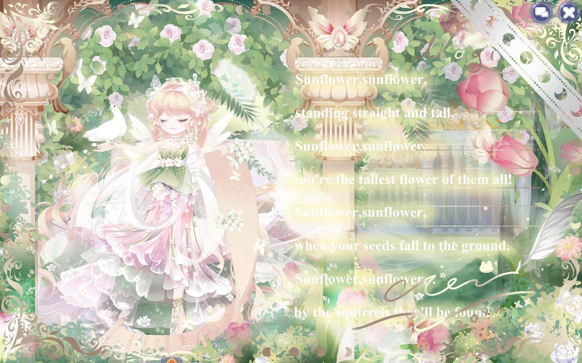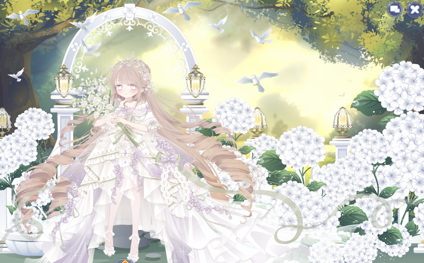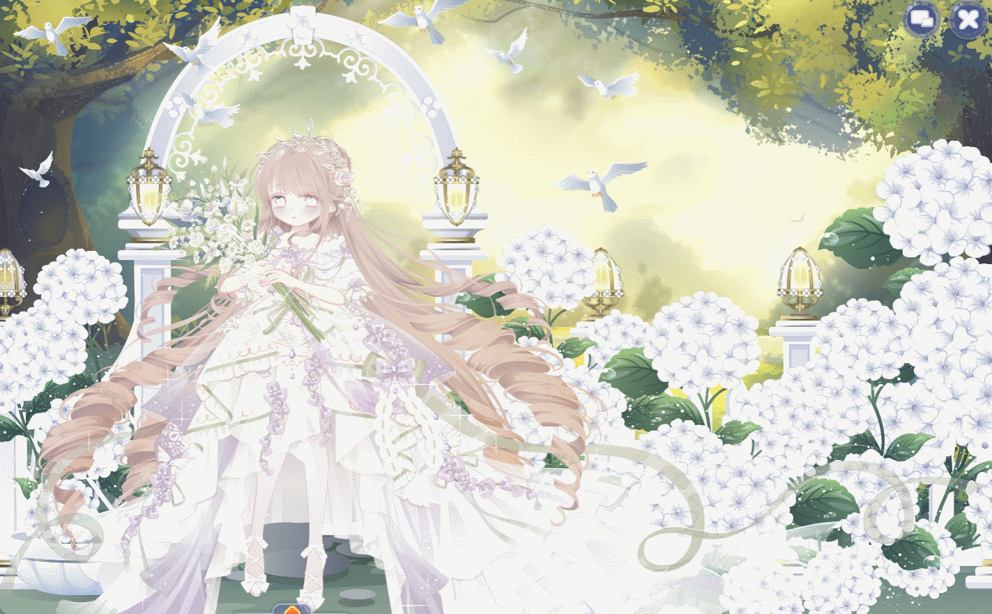 搭配部件:四季歌,琉音浮世微笑,栀子情书下装,栀子情书后摆,栀子情书连衣裙,栀子情书花篮,栀子情书花束,栀子情书帽子,悬光花庭飞鸟,悬光花庭背景,悬光花庭花丛,春的滤镜,春的花帘,落樱阳光洒落。