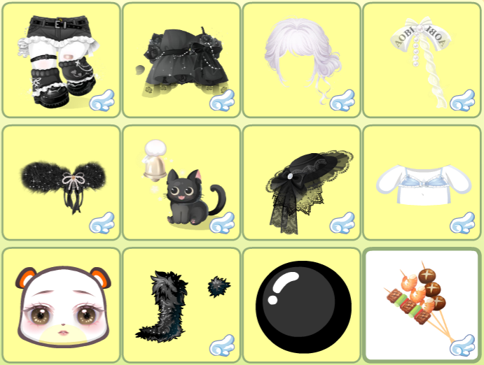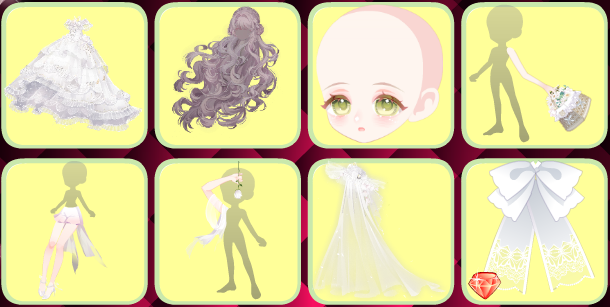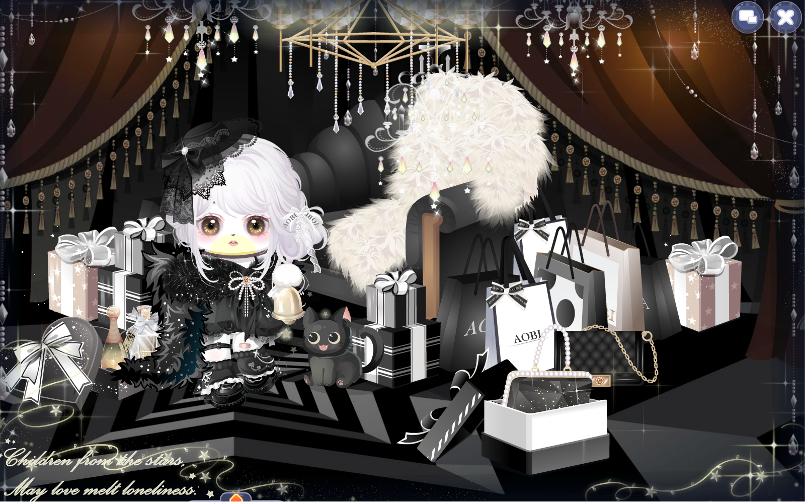 搭配部件:臻爱、真爱、暗欲侧丸子发、霜寒渡雪头饰、珍语假日披肩、召唤小黑铃、哥特学院蕾丝帽、迎海玩水上衣、辣妹甜酷笑颜、女王闪钻披肩、香颂假日背饰、守护星愿滤镜、时之童谣背景、霓虹贵族吊灯、甜蜜心意串灯、绒馨流珠宝石灯