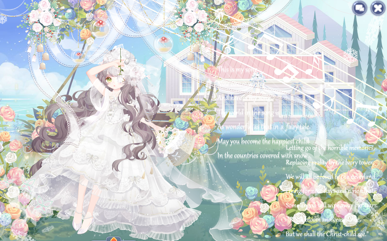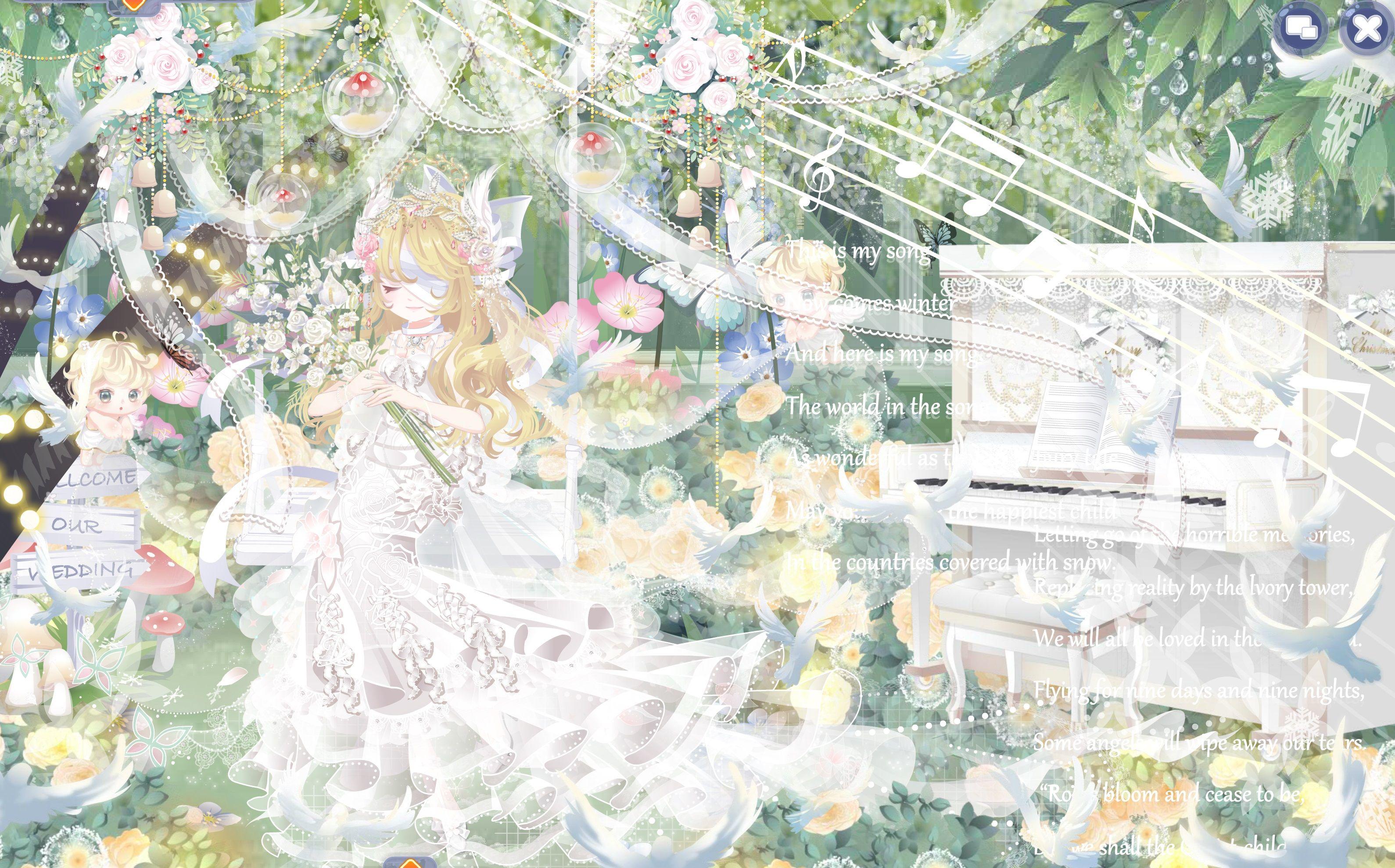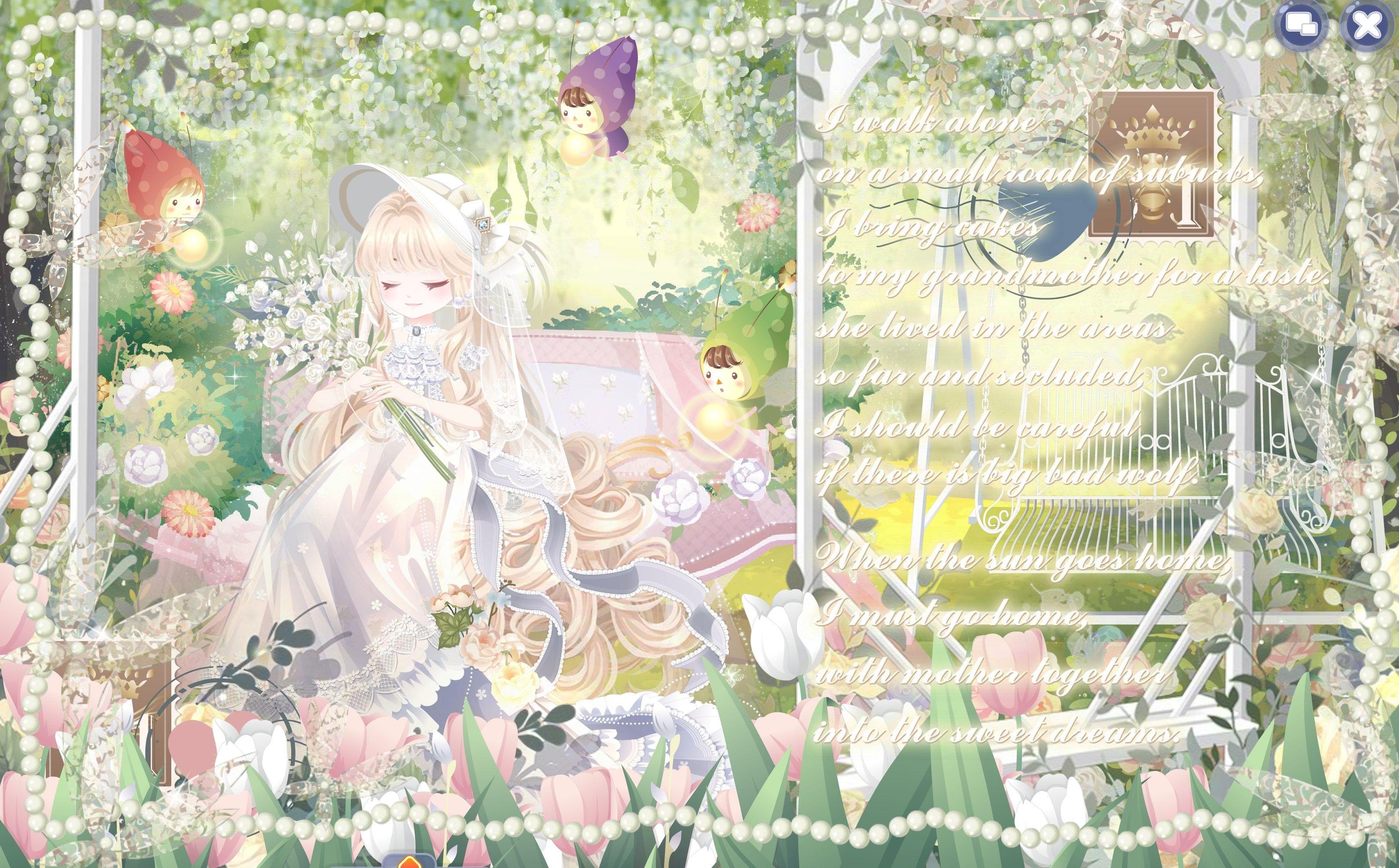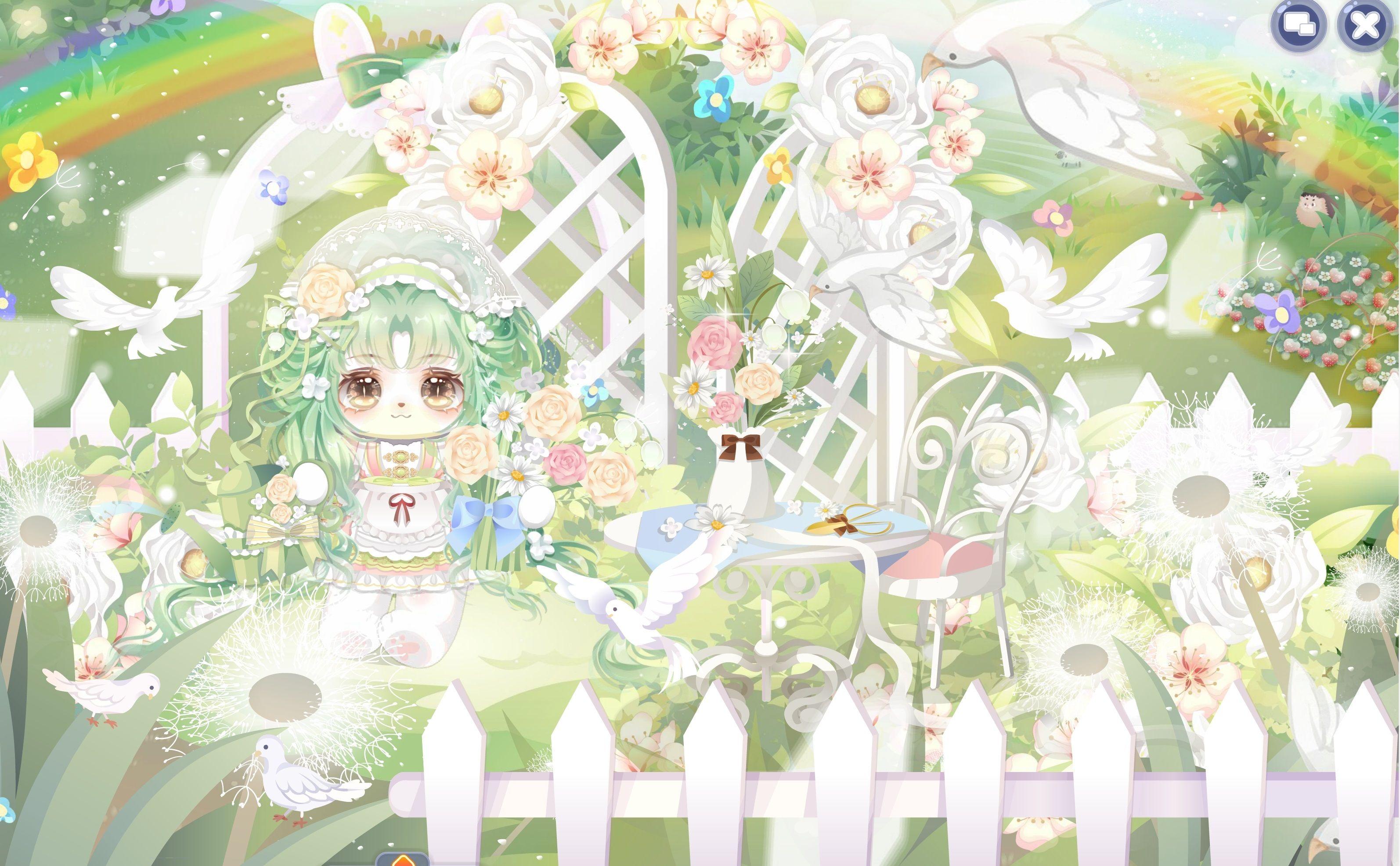 搭配部件:悬光花庭裙子,蔷薇心缱倦,浮花茶话会表情,春启乐章花篮,春的坐姿,春的玫瑰,韶时共我星月,纯真花少女头饰,悬光花庭花丛,悬光花庭秋千,新娘挪威木屋景,小红帽新娘坠花,雪之歌框架