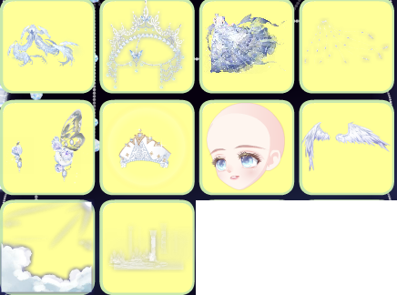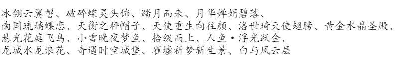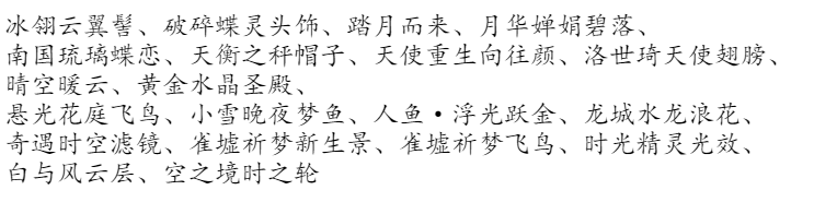 冰翎云翼髻、破碎蝶灵头饰、踏月而来、月华婵娟碧落、南国琉璃蝶恋、天衡之秤帽子、天(pbc)使重生向往颜、洛世琦天(pbc)使翅膀、黄金水晶圣殿、