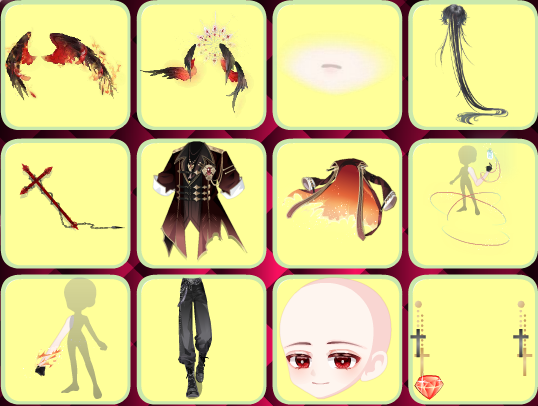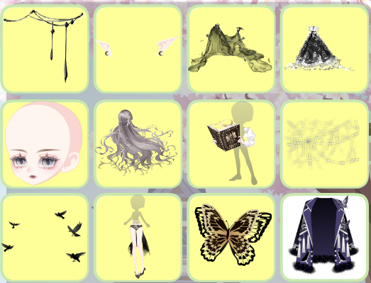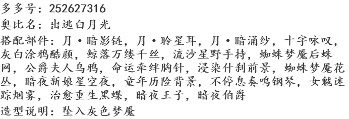搭配部件:月·蚀月残翼、月·暗涌纱、不要午夜入睡、紫韵凝香停留、紫韵凝香绽放、夜·礼服、宗罪舞台骷髅
