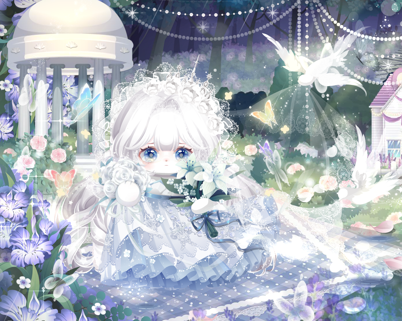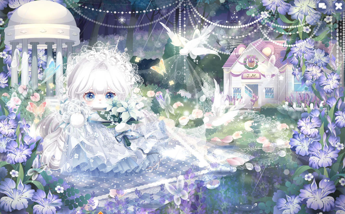 搭配部件:留声萦年害羞、留声萦年受约、墨韵画镜站姿、玄月公主发、悠然蓝公主头纱、蝴蝶飞飞发箍、芭蕾公主折纱、预言少女妆、恋·紫罗兰花、唯美长婚纱、