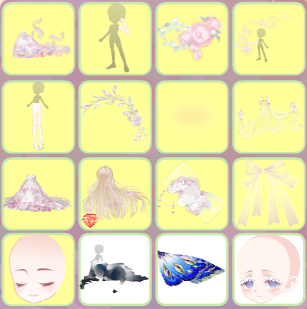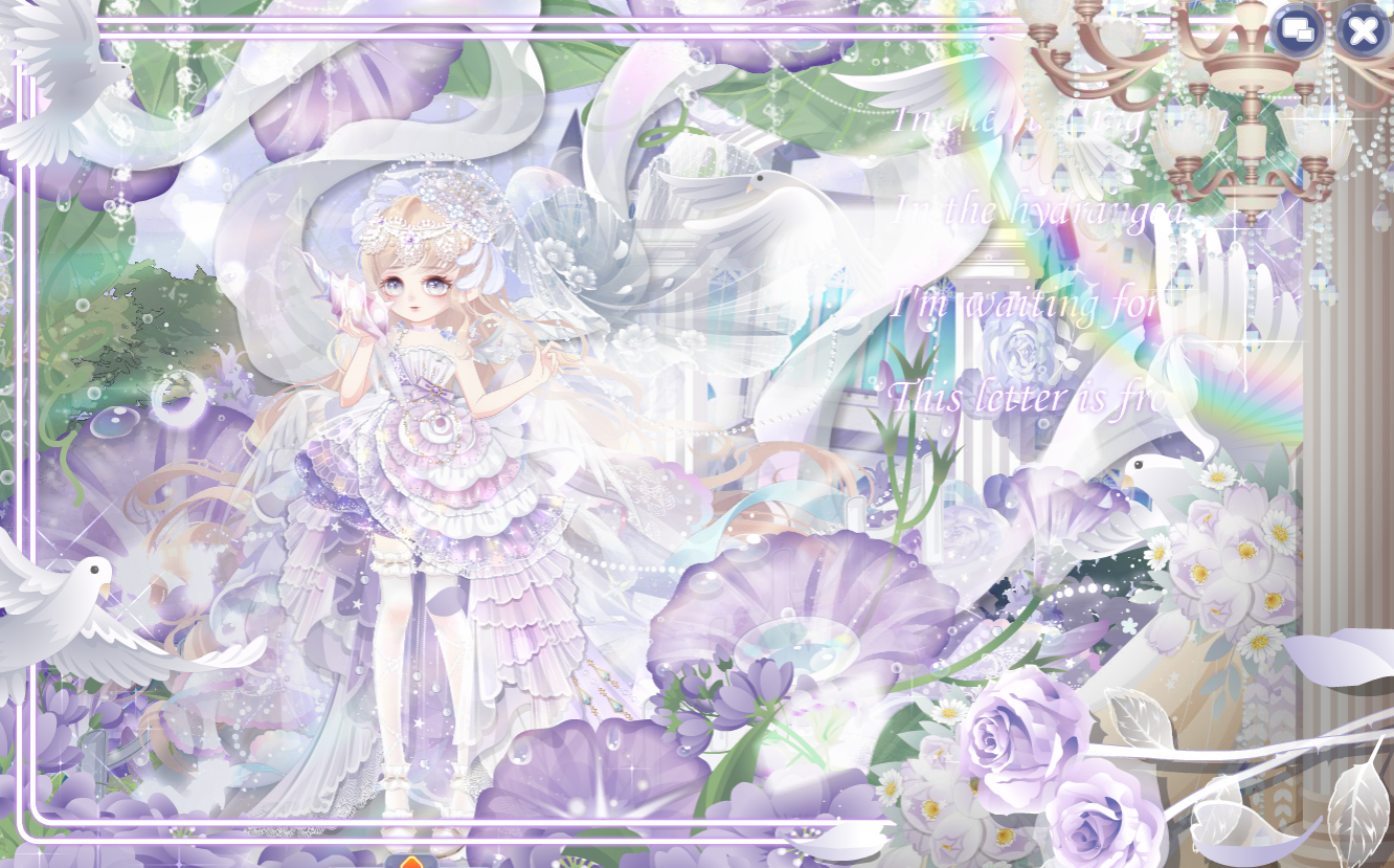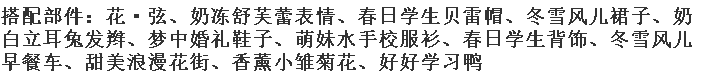 搭配部件:克洛莉丝,花·眠,花·弦,蝶上诗·花解语,星月梦语帽子,幻·梦境使者花环,花·影,花·蔓,星月梦语右袖,星月梦语左袖,无尽夏腿姿,含羞草蝴蝶结,沉默寡言嘴,花·语,新娘挪威木屋景,花·廊,荧蝶心跳讯号,乐·小熊指挥,梦幻爱心气球,糖心甜美花瓣