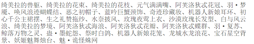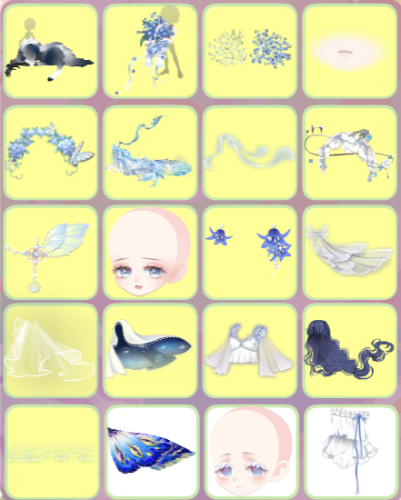 搭配部件:潮生梦语拖尾、潮生梦语左手、潮生梦语海螺、潮生梦语项链、奶冻舒芙蕾站姿、奶冻舒芙蕾卷发、墨韵画境妆、夜荷梦谣头饰、朝颜听雨翅膀、钻光琉璃裙子、紫语珊瑚头饰、芭蕾公主折纱、芭蕾公主拖纱、芭蕾公主舞纱、小红帽新娘额饰、涅槃新生之冠、潮生梦语背饰、挽月洒满星辰、朝颜听雨牵牛花、风信子庄园草坪、契约牢笼白鸽、芭蕾公主玫瑰花、奇遇时空城堡、女王嫁纱廊柱、暗香·白秀珠、结缘飘渺云梦泽、大兔子初恋框、大兔子守护桥、恋·紫罗兰花海