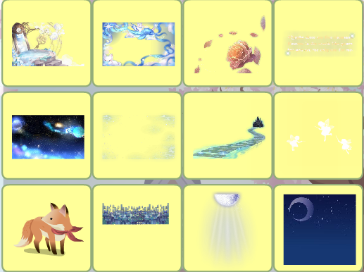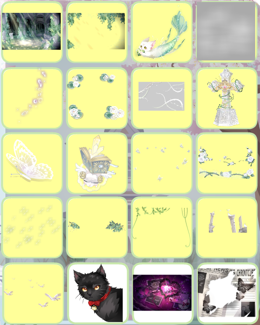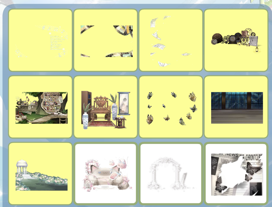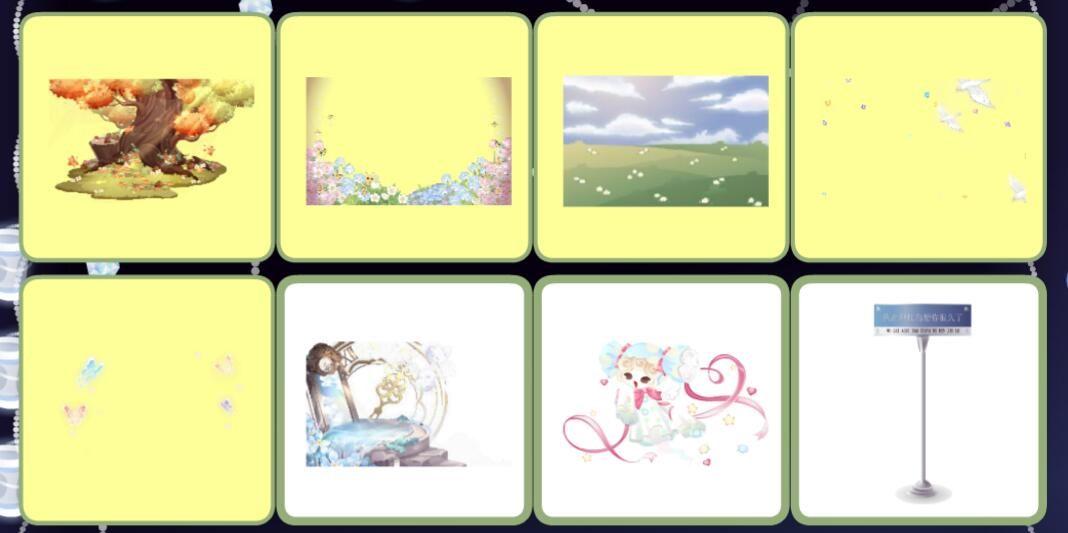 雪国列车童谣、夏·未尽时序、夏·远风回音、时之童谣时钟、魔法药剂实验室、古玩品鉴背饰、祈·秘密花蝶、龙宫深海隐居处、胡桃夹子庭院