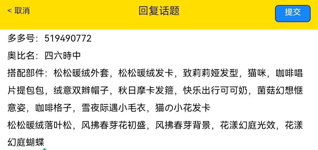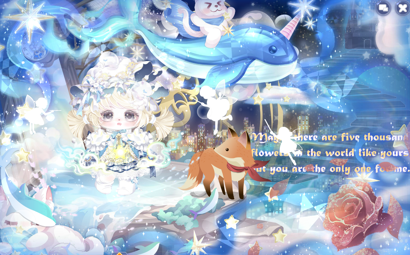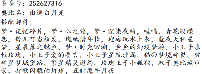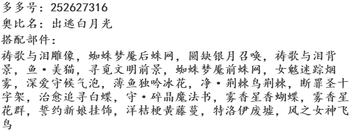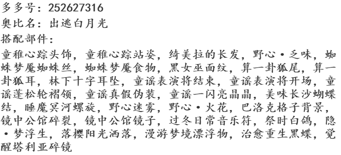 搭配部件:梦·透明哀歌、梦·花瓣占卜、梦·记忆碎片、旧物新声表情、紫星喵巫卷发、曜·绒绒体、曜·天秤祈愿、浅语百合、游雾魂梦悠扬、星旅者的星途、云朵旋律长廊、鸢语调香师香氛、深海幻影泡沫、深海祈愿救赎光、游雾天海弦音、游雾万籁苍穹、游雾如鱼得水