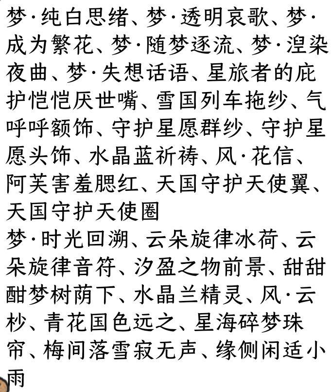 松松暖绒编发、古早委屈颜、姜香雪夜站姿、缤纷采购小提篮、气呼呼额饰、奥比灰萌皮、红蘑菇小妖裙、仙踪迷路小红帽、仙踪绿野与童话、秋采少女编织篮、寅时破晓晨鸟、寅时破晓晨光、