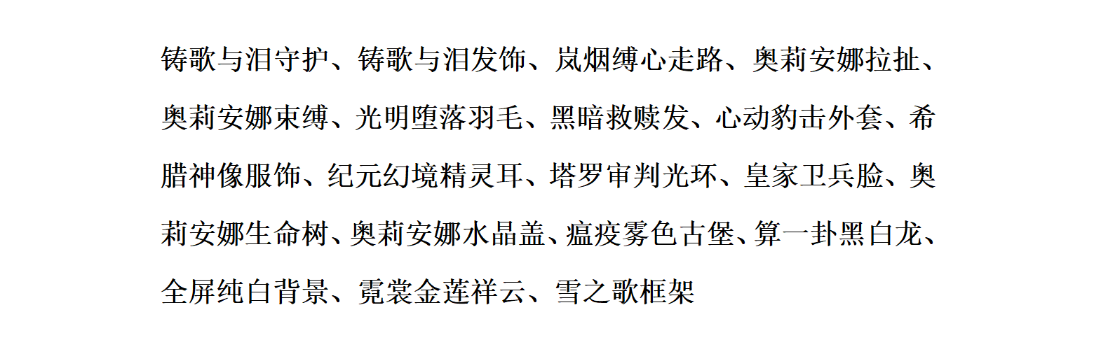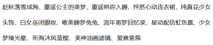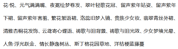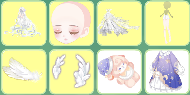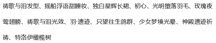 童稚心踪头饰、童稚心踪白裙、童稚心踪罩裙、白昼焙香站姿、珺璟如晔、暗影艺术画卷、梦·妮娜圣诞鹿角、王之贵女发型、女王暗夜耳环、鎏金痕迹鸢尾、水瓶座星言、珍藏惊梦背饰、仲夜魔法魔卡、少女梦境光晕、少女梦境光罩、人鱼·浮光跃金、21克灵魂星辰、希王子漂浮镜阵、古堡人偶密室灯、时光精灵光效