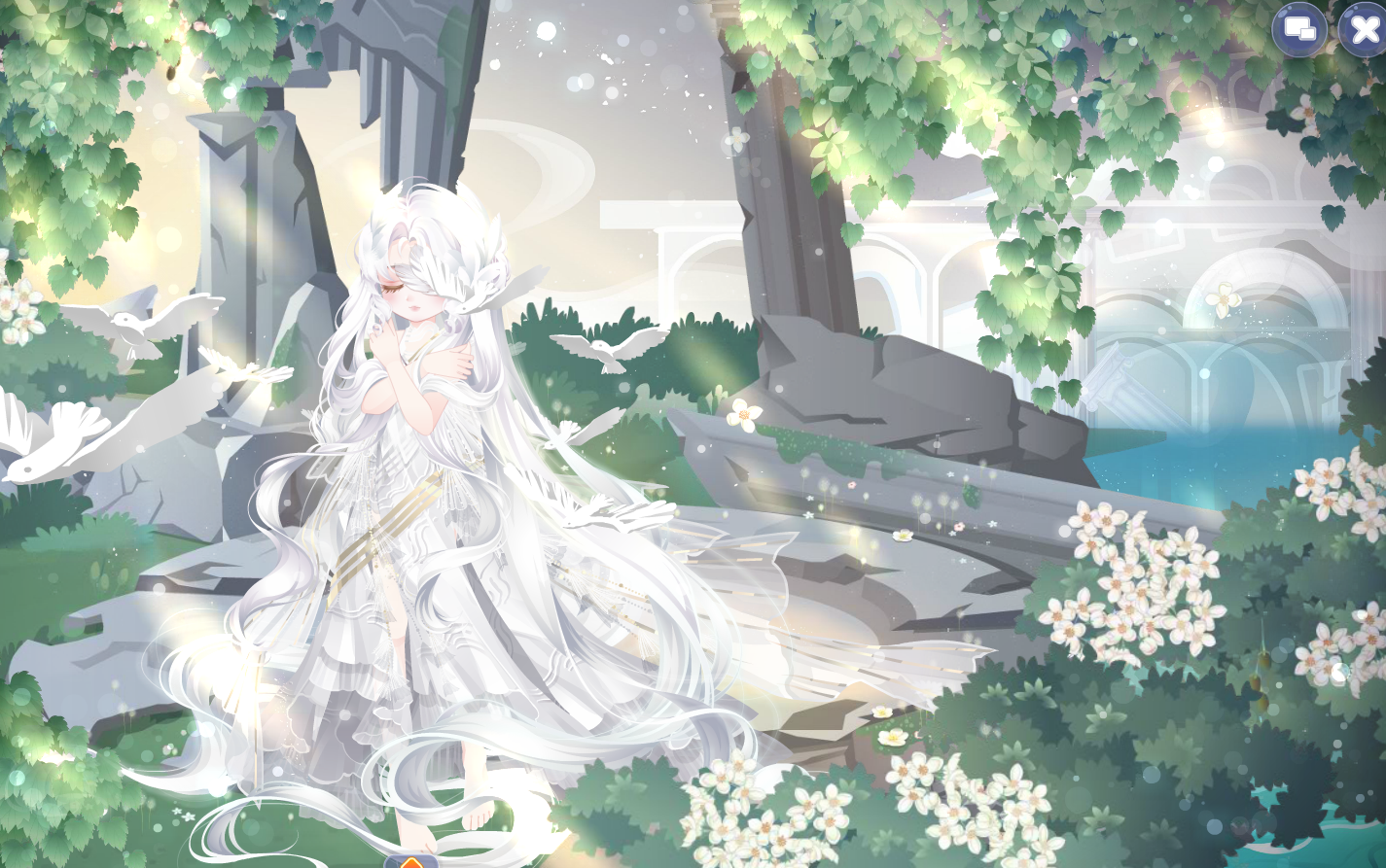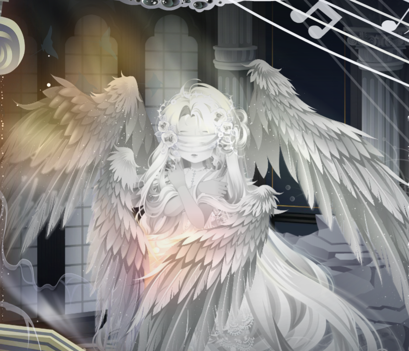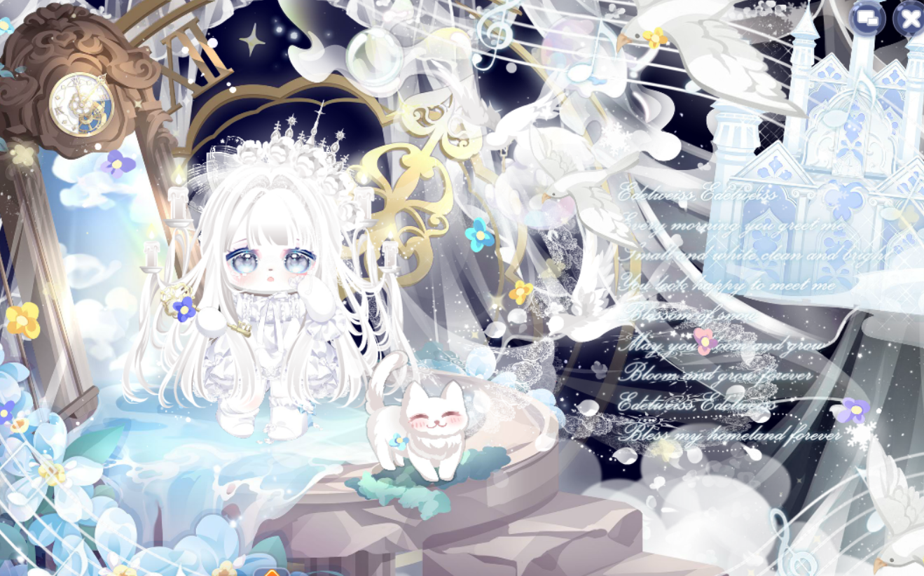 搭配部件:祷歌与泪残柱、祷歌与泪裙、祷歌与泪裙、纯白誓言侧头纱、精灵恋人纱饰、蚕丝袅袅耳翼、英式新娘蝴蝶结、白天鹅头饰、白女巫闭眼妆、祷歌与泪背景、祷歌与泪光效、绣球花篱笆背饰、金狮·云端、凝辉回转连廊、铃语奢享大提琴、雾香星花群、白与风云层、仙·睡莲仙境白莲