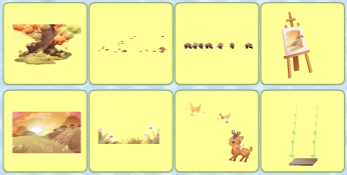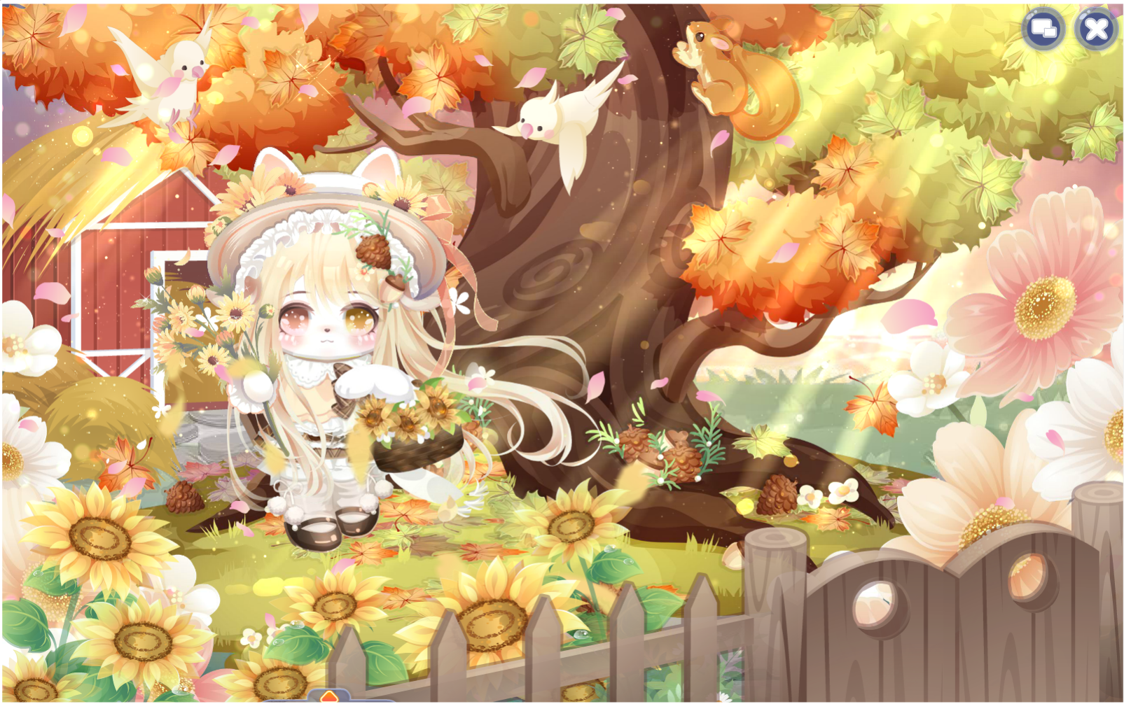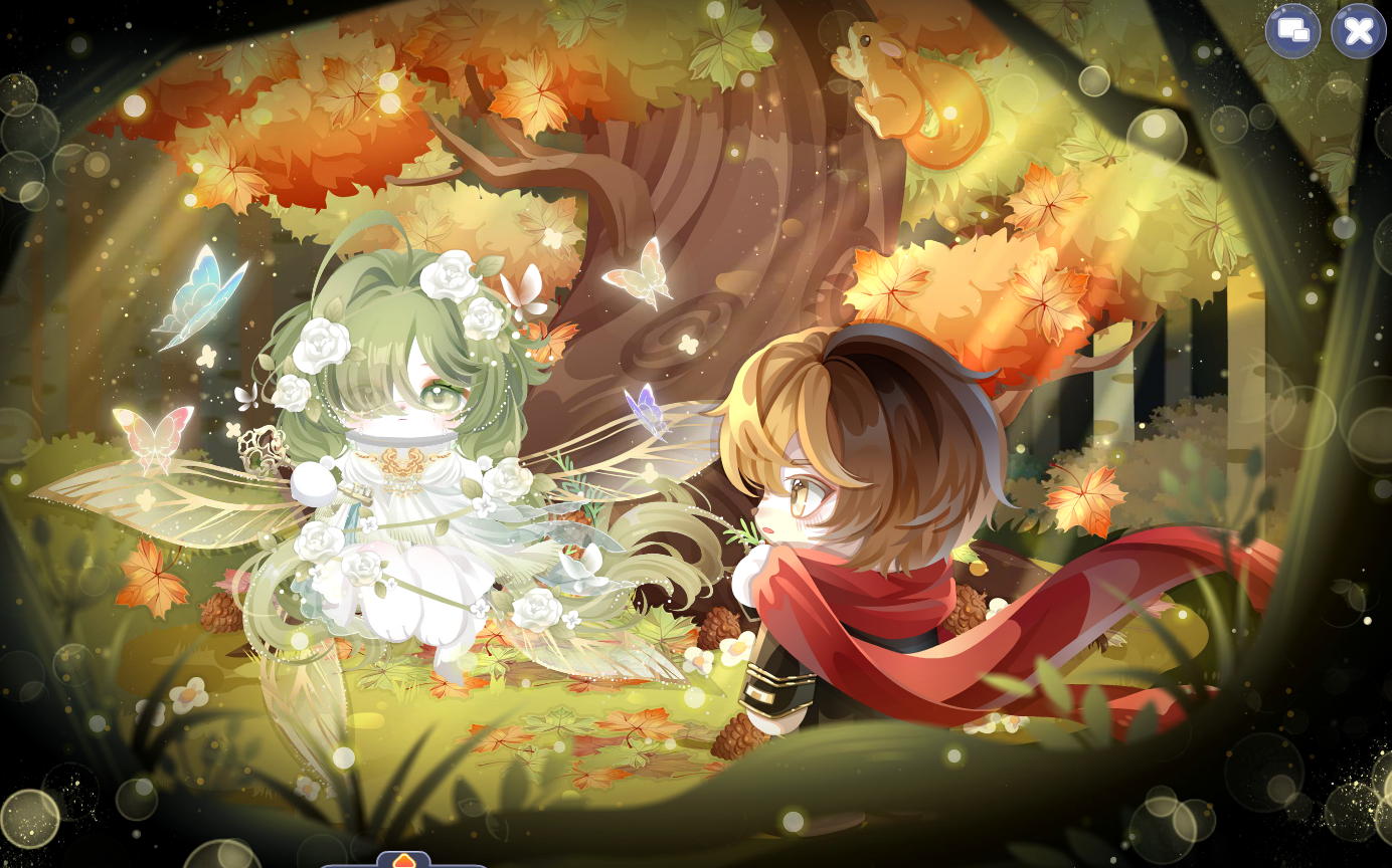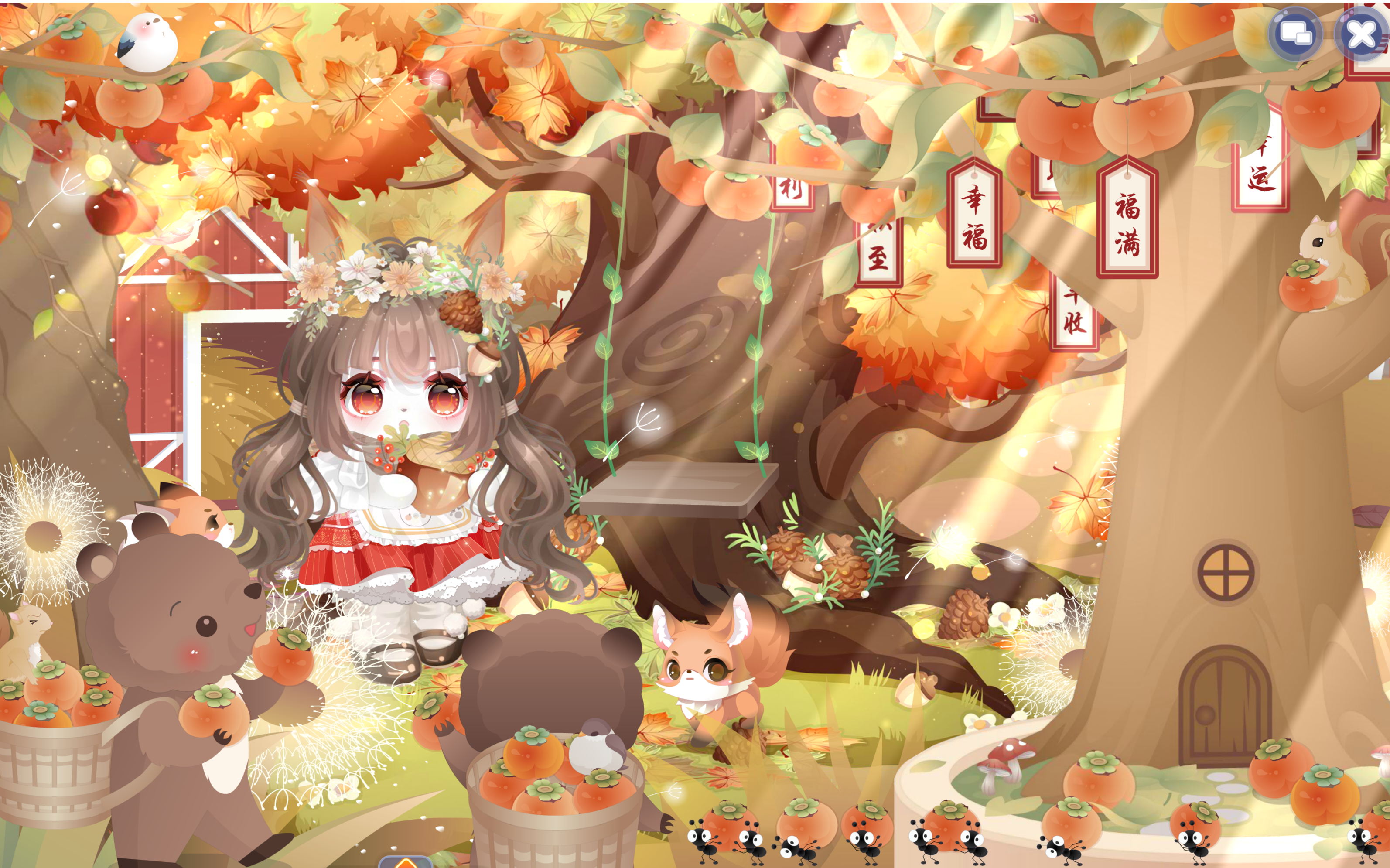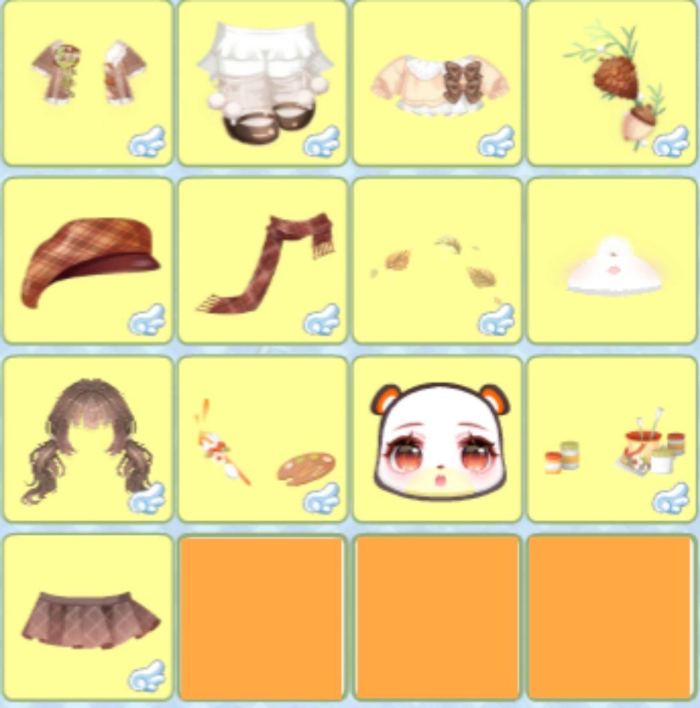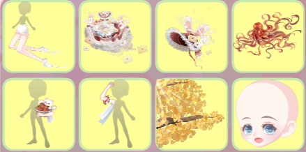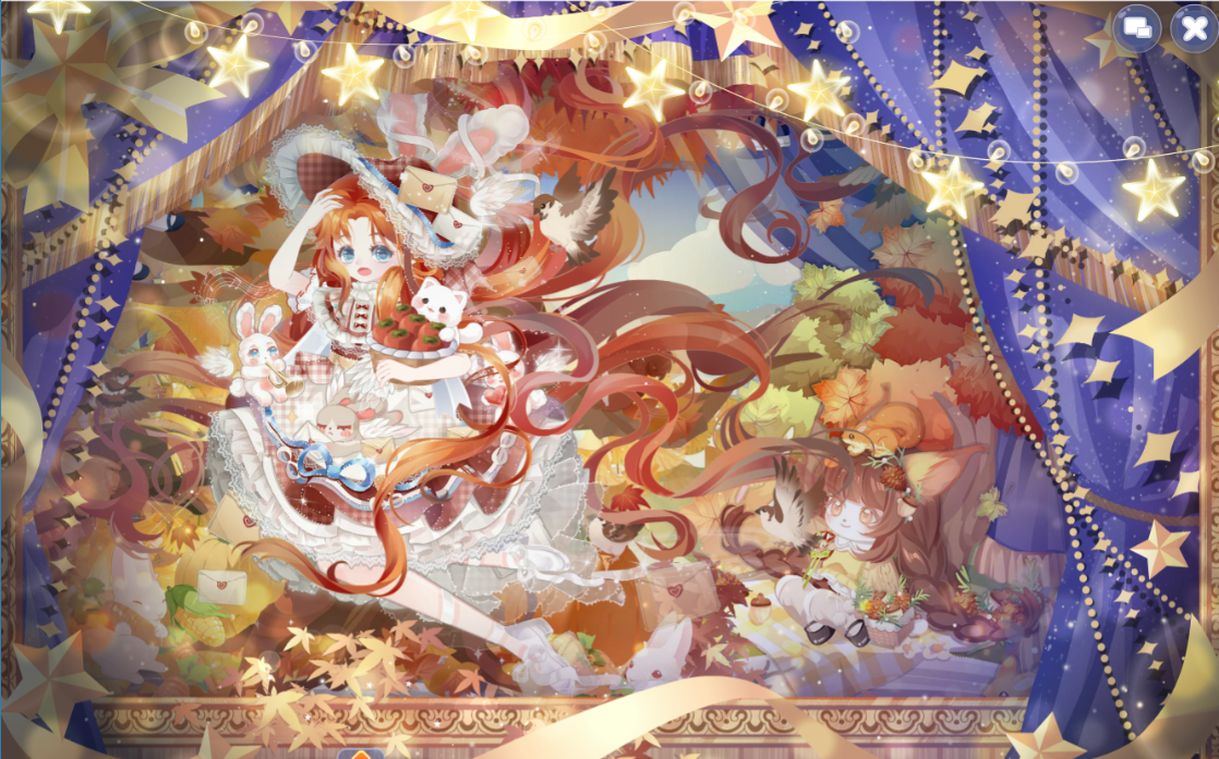 搭配部件:晶落星梦跪星姿、迷兔趣游兔兔裙、迷兔趣游兔兔帽、灵悦燃心、霜降柿糖果篮、霜降柿糖抚发、椅·银杏树梢、雪精灵惊讶妆、童稚心踪故事书、绒雪甜箱灯饰、枫歌秋笺枫树、甜冬企鹅远景、缤纷幻想蓝小伙伴、童谣剧场帷幕、星动配信缎带、乐舞苗疆枫木、秋游落叶长街