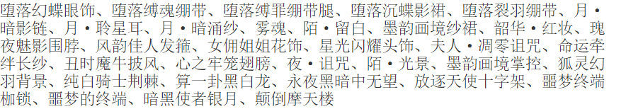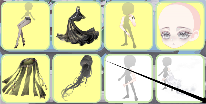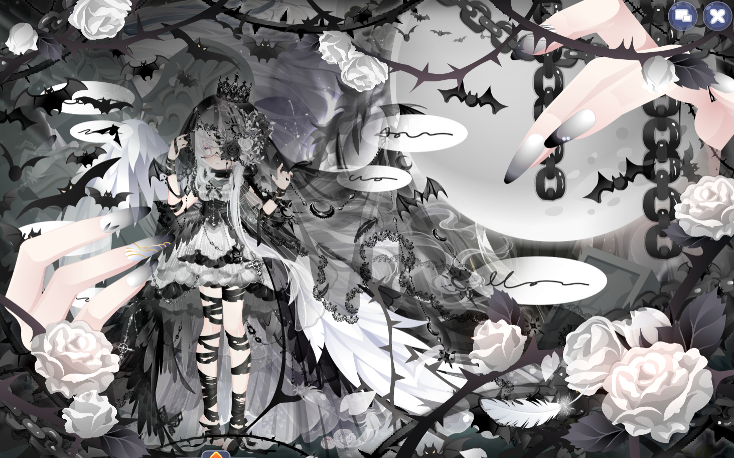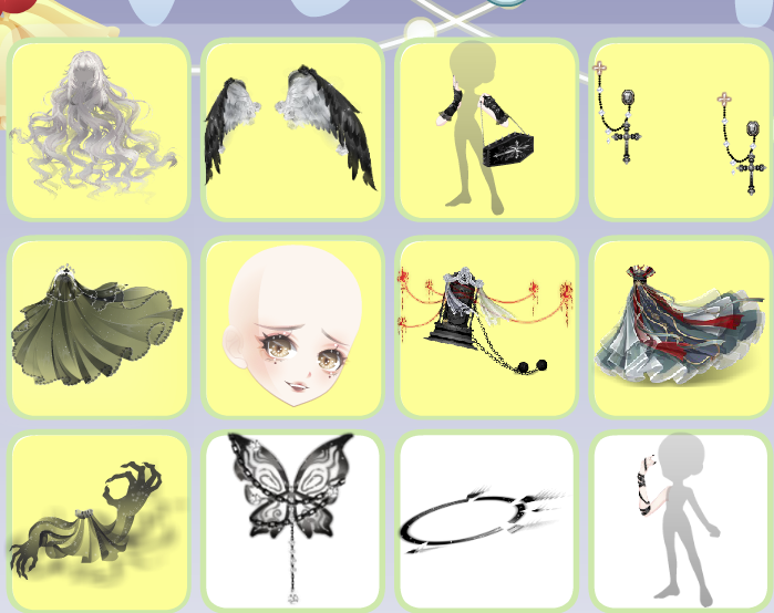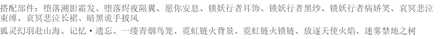 搭配部件:堕落幻蝶眼饰、堕落黯陨黑环、堕落沉蝶影裙、堕落溯影霜发、夜冕绘梦站姿、陌·引蝶、奥莉安娜拉扯、奥莉安娜束缚、鬼魅·夜幕降临、鬼魅·绞杀爱意、古堡人偶皇冠、白女巫闭眼妆、夜·迷雾、夜·女仆、陌·戏蝶、陌·镜花、契约牢笼、幽蝶女王吊链、夫人·末日使者、雪之歌框架、美狄亚女巫背景