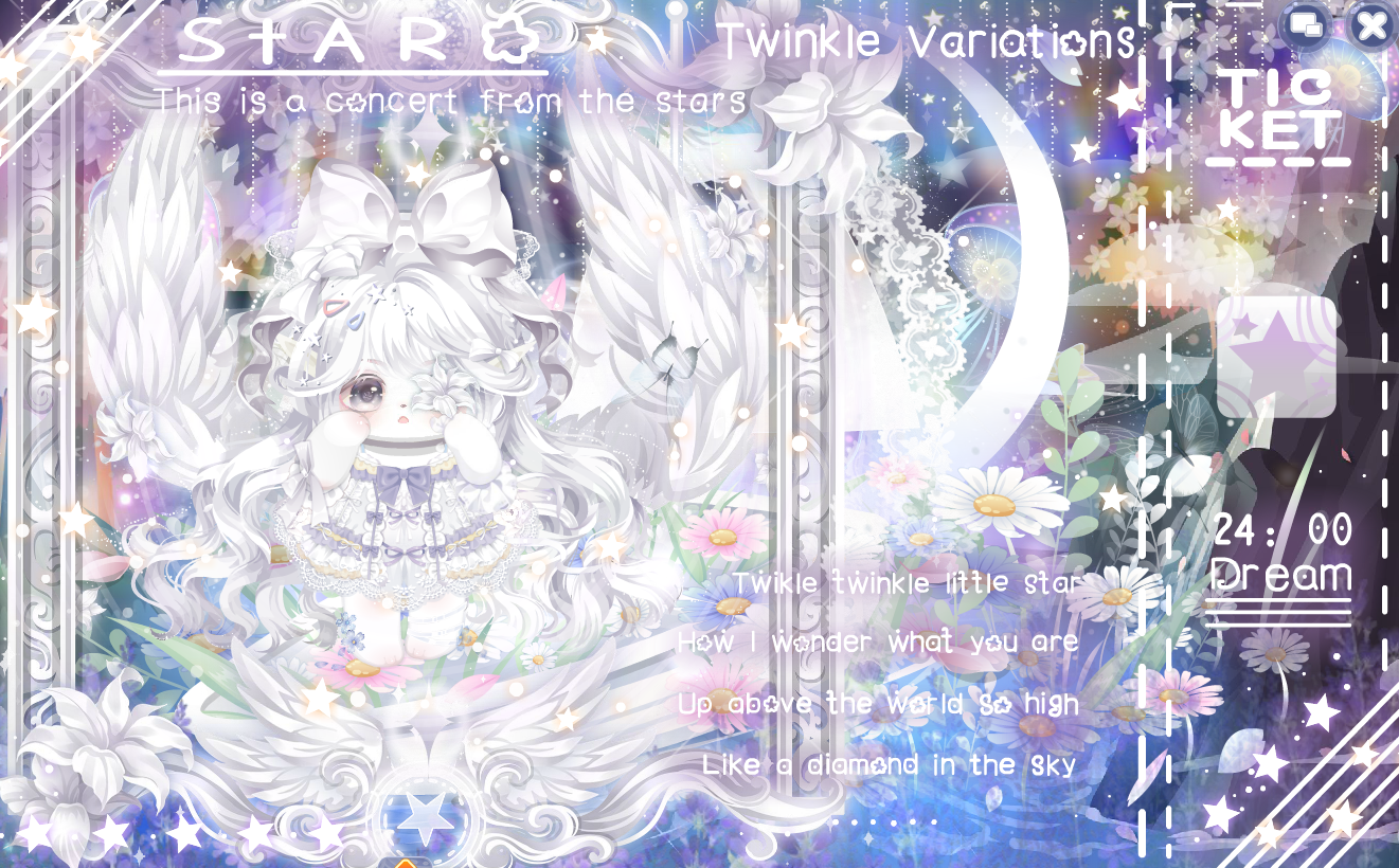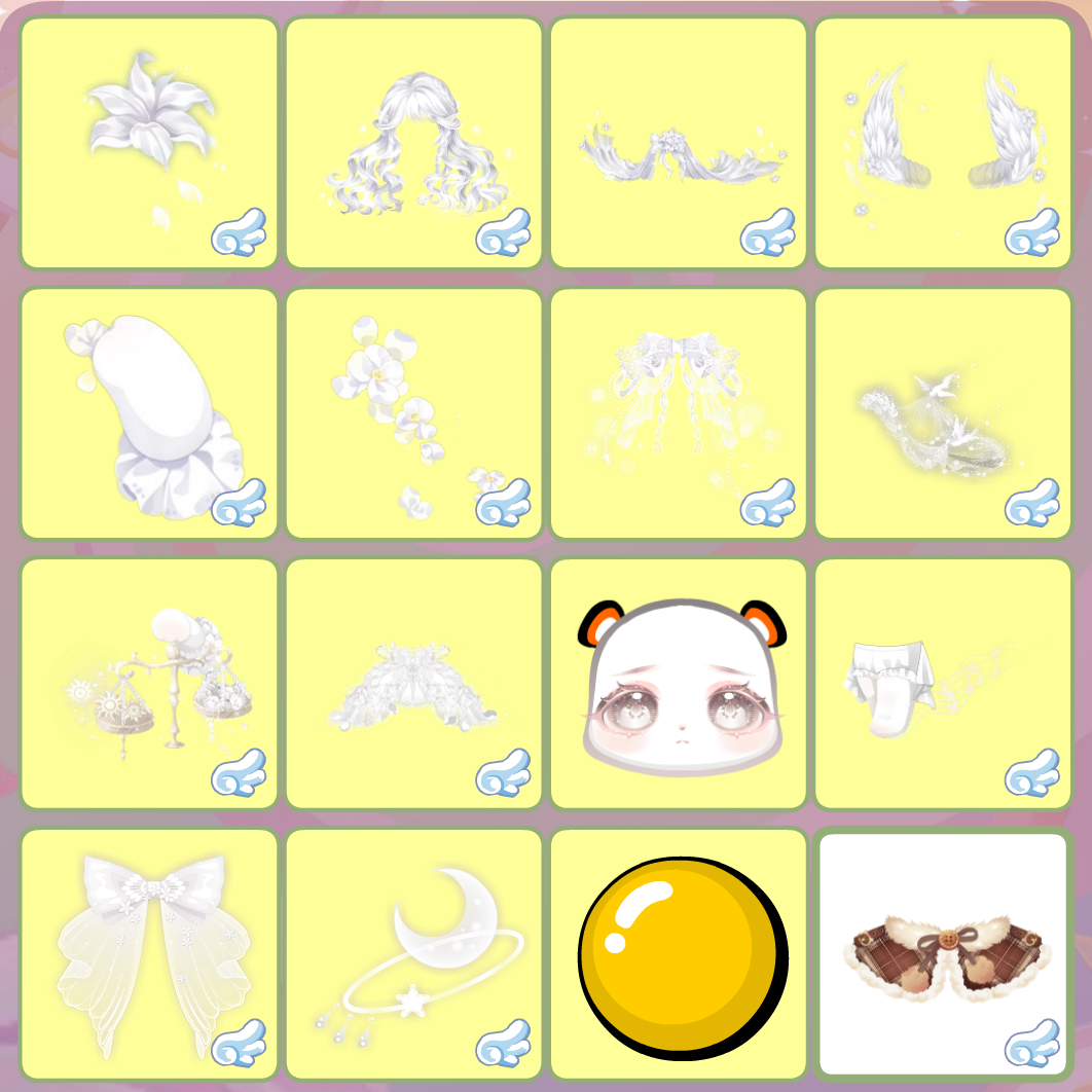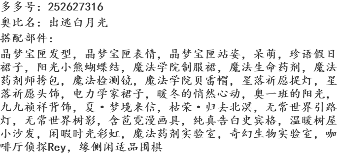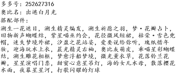 搭配部件:溯生一花遮目、溯生碎花边裙、溯生精灵编发、溯生祈愿之羽、梦·花瓣占卜、梦·成为繁华、旧物新声蝴蝶结、曜·衔星来、曜·天秤祈愿、曜·流光裙、曜·流光祈盼、沐音享乐站姿、时光精灵蝴蝶结、时光精灵魔法、溯生雕花相框、曜·神谕之门、云朵旋律长廊、云朵旋律曼莎、拾光·天籁之音、时光精灵背景