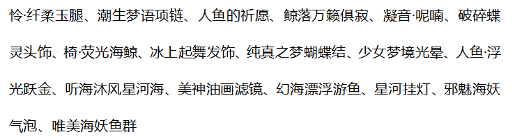 怜·凝脂素面、蝶·星冕、独白玉骨璇玑、昼长夜短·筱凉、蚕丝袅袅翅膀、湖心梦纹短纱、消失魔法长发型、噩梦终端惊讶嘴、射手座圣光弓箭、永恒之梦翅膀、大乌鸷弥城滤镜、阿芙洛狄忒神像、小奥比坠海气泡、人鱼·浮光跃金、感恩女神天(tian)使花、重生追寻神殿景、雾香星香蝴蝶、爱琴海新娘竖琴
