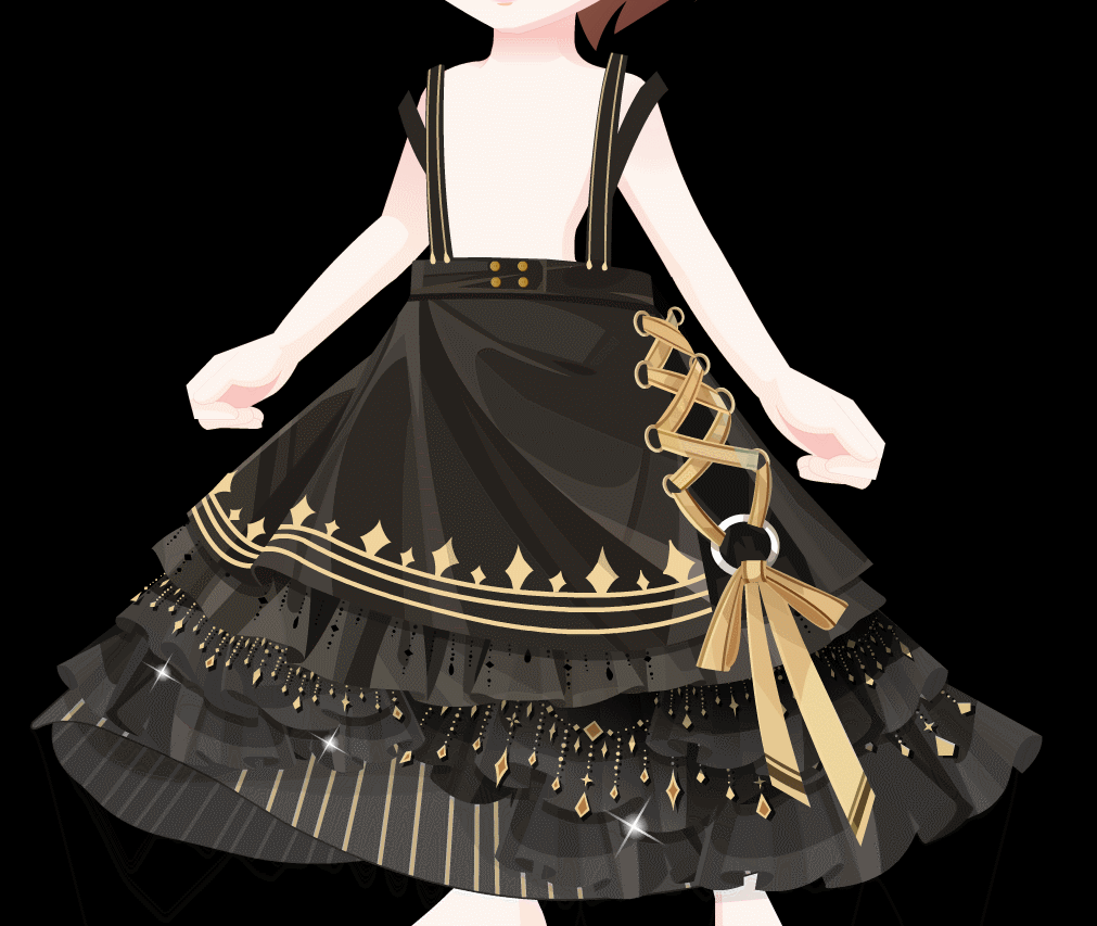 物品解析:裙子其实跟上面的是一样的,只是自带了一个上衣,说真的很希望上衣单独出一个,感觉搭配男装也不错的。下面的裙子一层一层的很棒,闪闪的,很喜欢第一层裙子这样绑带圆圈的设计。很多元化的一条裙子。