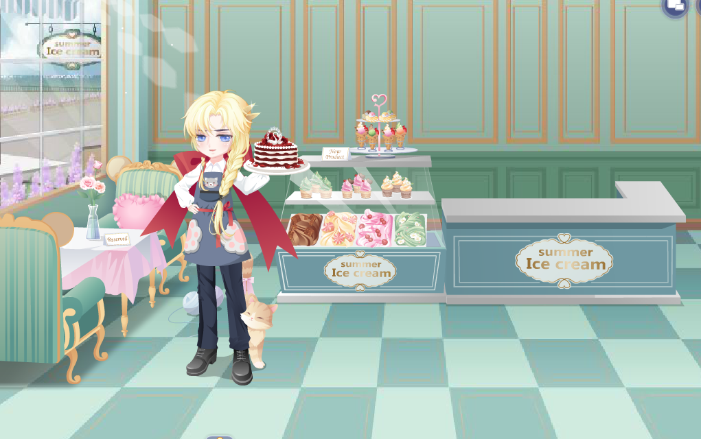 搭配部件:瑞文间谍妆腹黑妆 小欧惊喜萌围裙 幻海大祭司金发 英伦校服西裤 猫先生雪糕店 猫先生雪糕台 猫先生雪糕椅