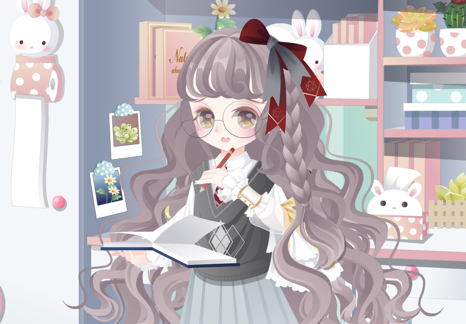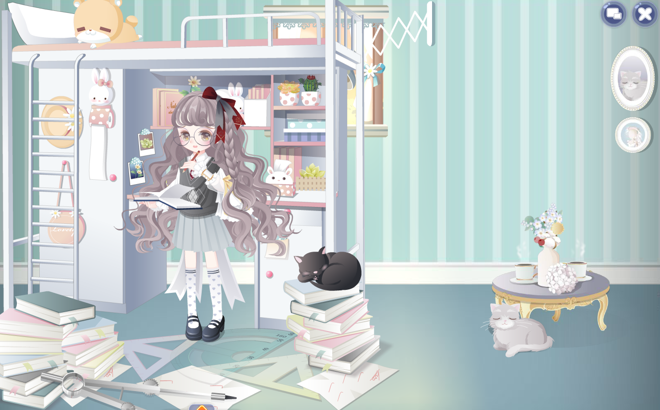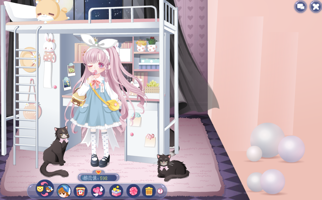 精致间谍粉长发、小学吃棒棒糖手、小学制服娃娃裙、萌妹校服小皮鞋、校园宿舍床、莱洁莉卡香水妆、白色公主蝴蝶结、二维灰度粉空间、黑小耶猫女房间、黑小耶猫女地毯、黑小耶猫女黑猫