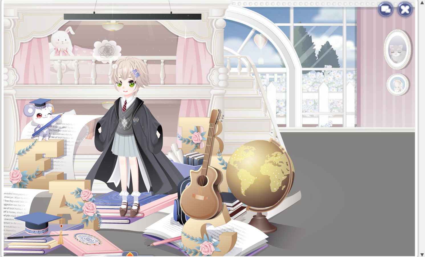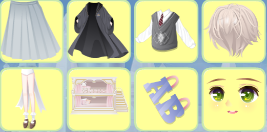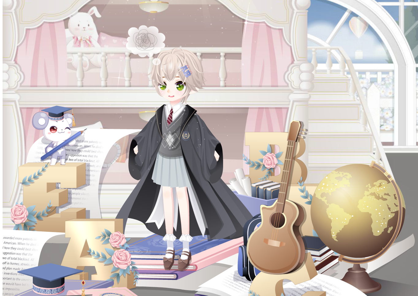 搭配部件:英式学妹裙子,英式学院外套,英式学长上衣,英式学长短发,学姐小皮鞋,贵族学校宿舍床,英语科代发夹,阿拉斯魔女面妆,童话工作室花园,设计间室内,设计间墙挂画,呆萌小迷糊气泡,自由旅行者吉他,化学科代实验灯,英语科代补习,探索员地球仪