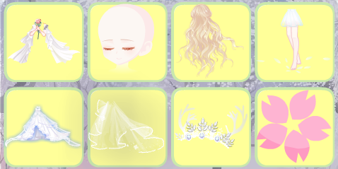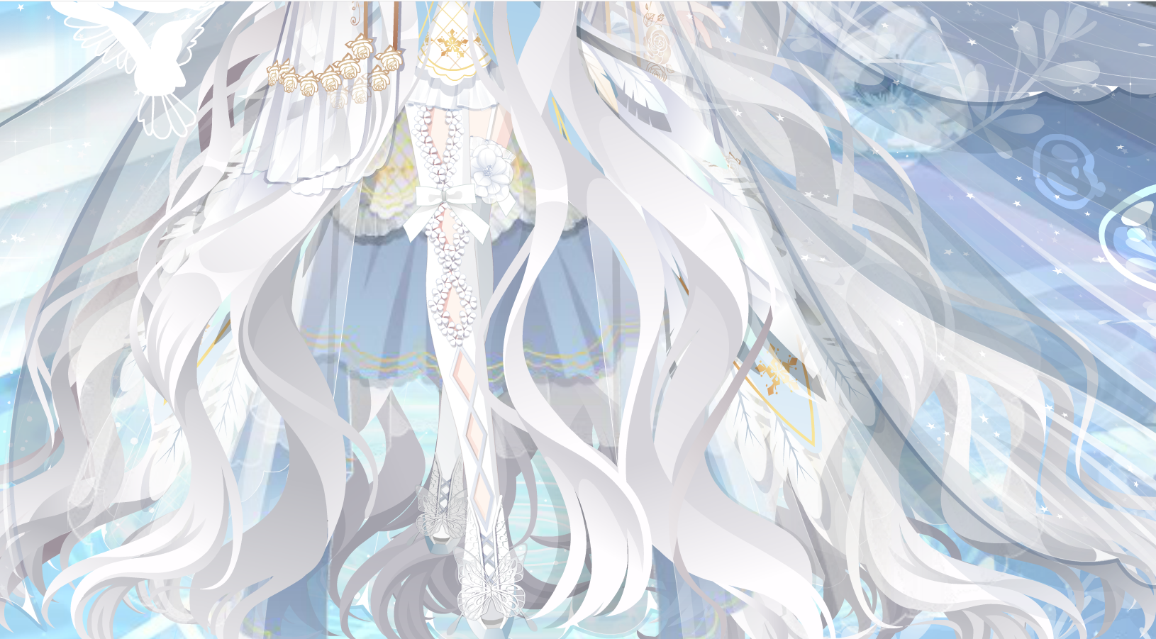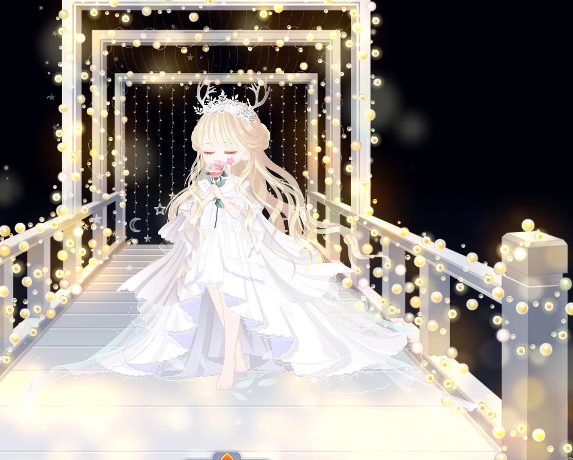 搭配部件:闰年祈福玫瑰,沉睡精灵美梦妆,西蒙内塔长发,涅槃零落舞步,涅槃夜宴白光,生之礼赞拖纱,誓约新娘皇冠,粉樱面贴,浪漫传说灯廊,云端全屏背景卡