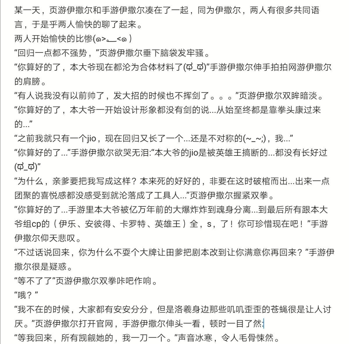 基本上官方有的剧情,在作者这里都得到了升华,让人看着快乐,也不缺乏伊洛这对cp给我们带来的点滴感动和精彩。