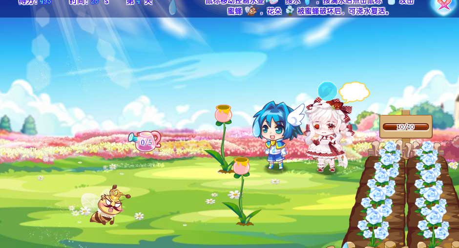 种花可以考虑直接浇水到蜜蜂头上,游戏会判定为消灭蜜蜂,但你种的花这一次不会被抵消,相当于一朵花消灭两只蜜蜂,但是不要为了一次灭两个而特意浇到蜜蜂头上,容易因为花朵收集不够被后来的蜜蜂吃花.