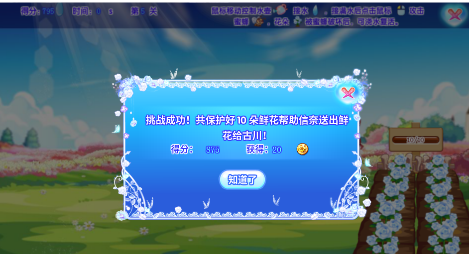 首先剖析游戏规则:主人公可以选择累计雨水来种花阻拦蜜蜂或者使用伙伴技能来阻挡蜜蜂,亦可以通过浇水来复活被破坏的花朵