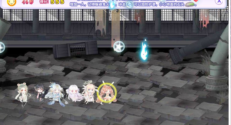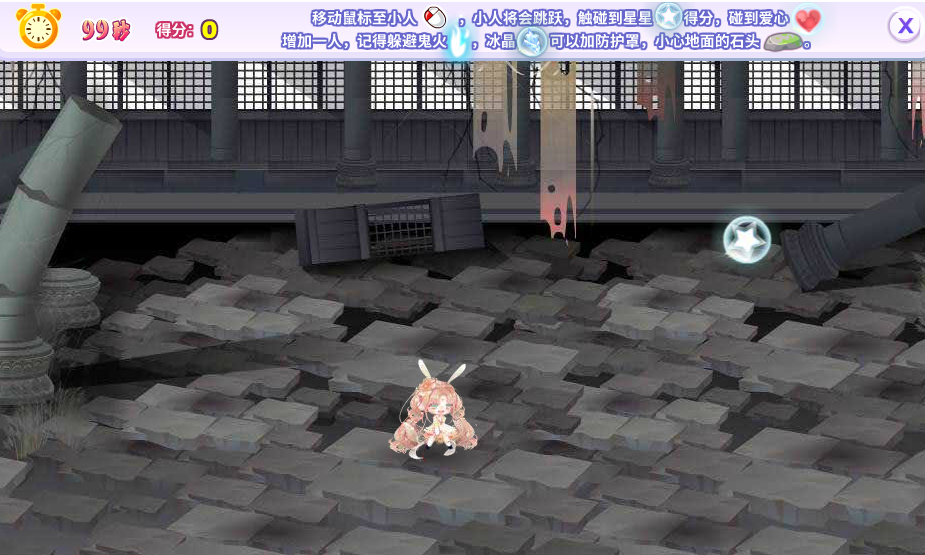 玩法:鼠标滑动至小人身上,小人会起跳,也就意味着可以让不同的小人在不同的时间起跳,躲避石头的时候尽可能地盯着小人,当石头到每个小人跟前时再把鼠标滑动至小人身上,小人就会及时起跳,起到规避石头的作用