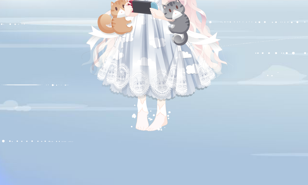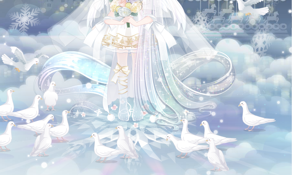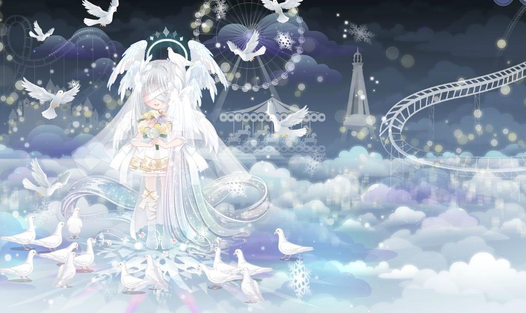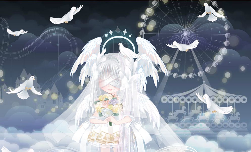 整个画面为浅色系,银白发的少女手捧着花,周围的白鸽围绕在她身边,背后的游乐园在这夜色倒是多了一分寂寞。