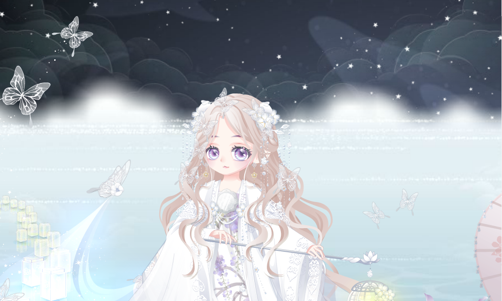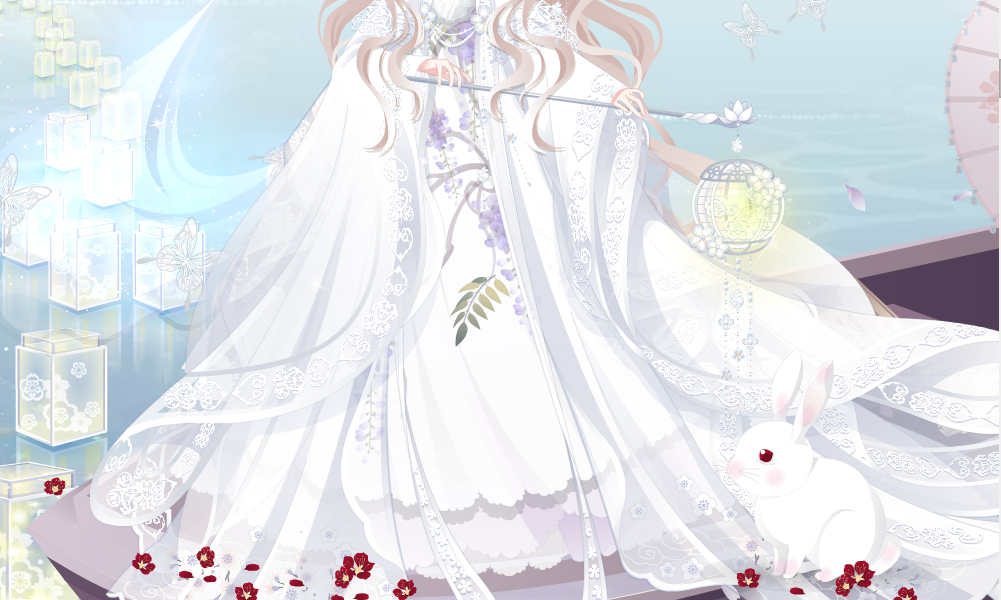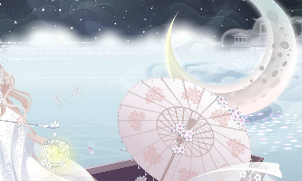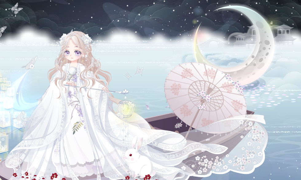 浅色系选手!扑面而来的是淡淡的仙气和栀子花的香味,白衣少女手拿宫灯,裙上绣的是紫藤萝,显得整个人清新也不失艳丽,脱变套的蝴蝶和玛丽发搭配起来在古风里也让人眼前一亮,黑猫的俏丽与裙上的紫藤萝显得极为恰当,身后的月亮和纸伞也包含着一丝凄凉之意,这又是哪位少女提灯寻找自己未到来的心上人呢?