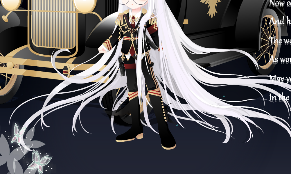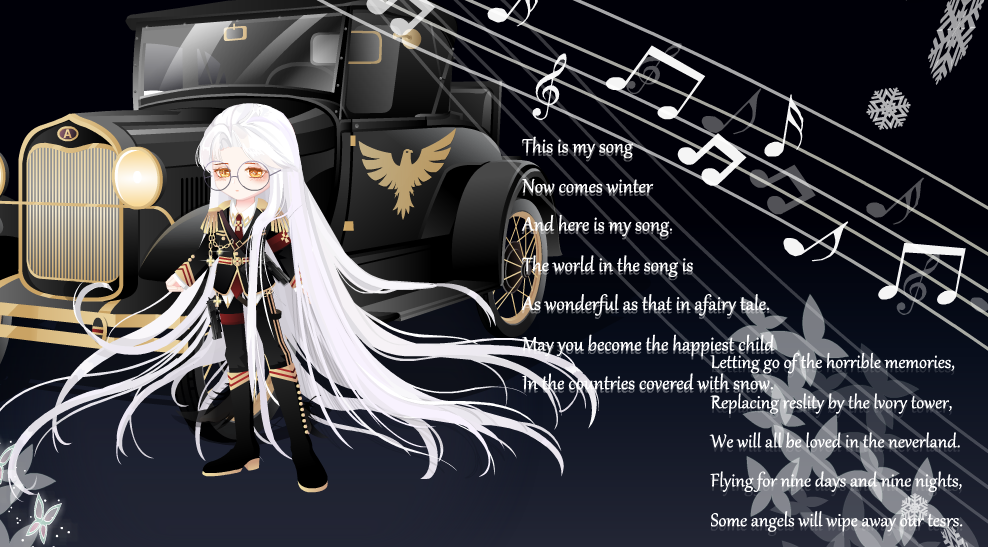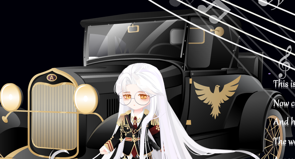 是英伦风小正太吗!白色长发在较暗的背景下并不突兀,也正好和同样亮色的表情相适应,鹿桥寄心的表情是真的吹爆!黑熊眼镜+鹿桥寄心表情使他多了一分呆萌w 帅气军衣+军车的搭配谁不爱,雪之歌的框架看起来多了高端大气上档次。我先爱了