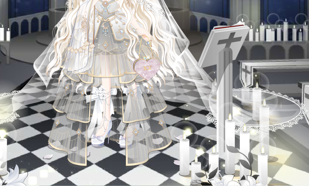 无论是睡美人金色长发,还是迷雾禁地的头饰和圣女裙,金色的搭配似乎更加符合圣女/修女的形象,闰年头纱更添加了神秘感,手姿仿佛是在思考什么,背后的黑化之魂更是让人不禁猜测背后的故事。