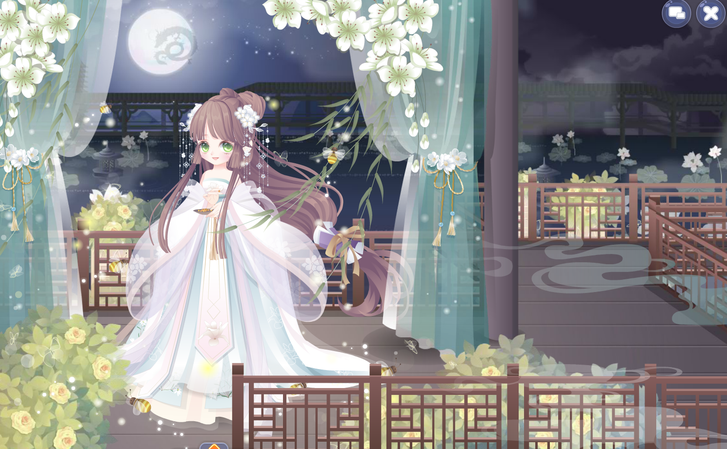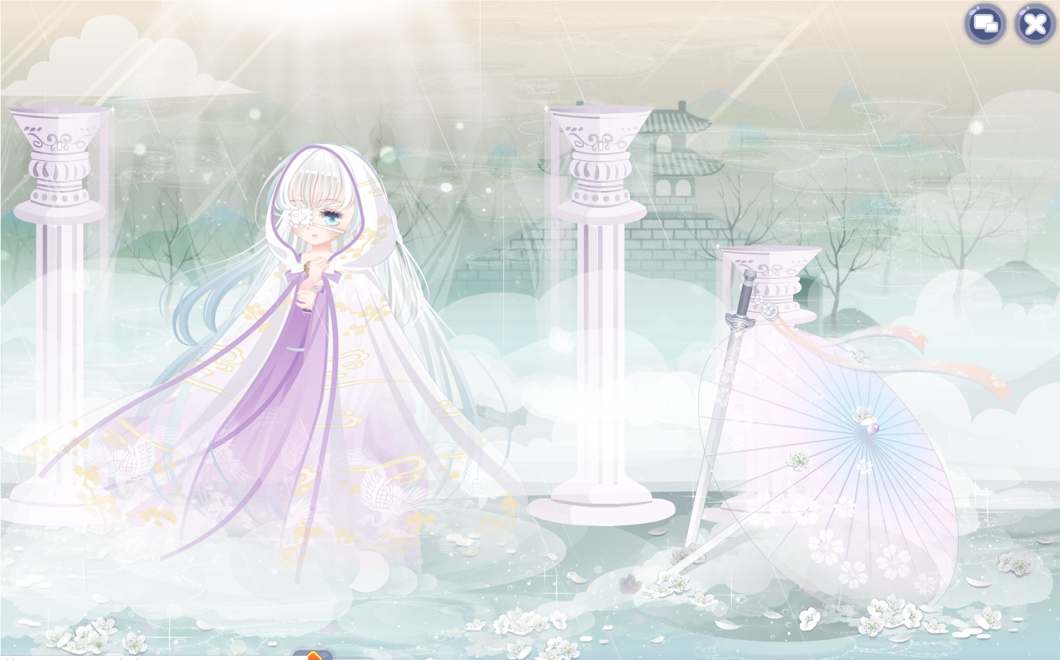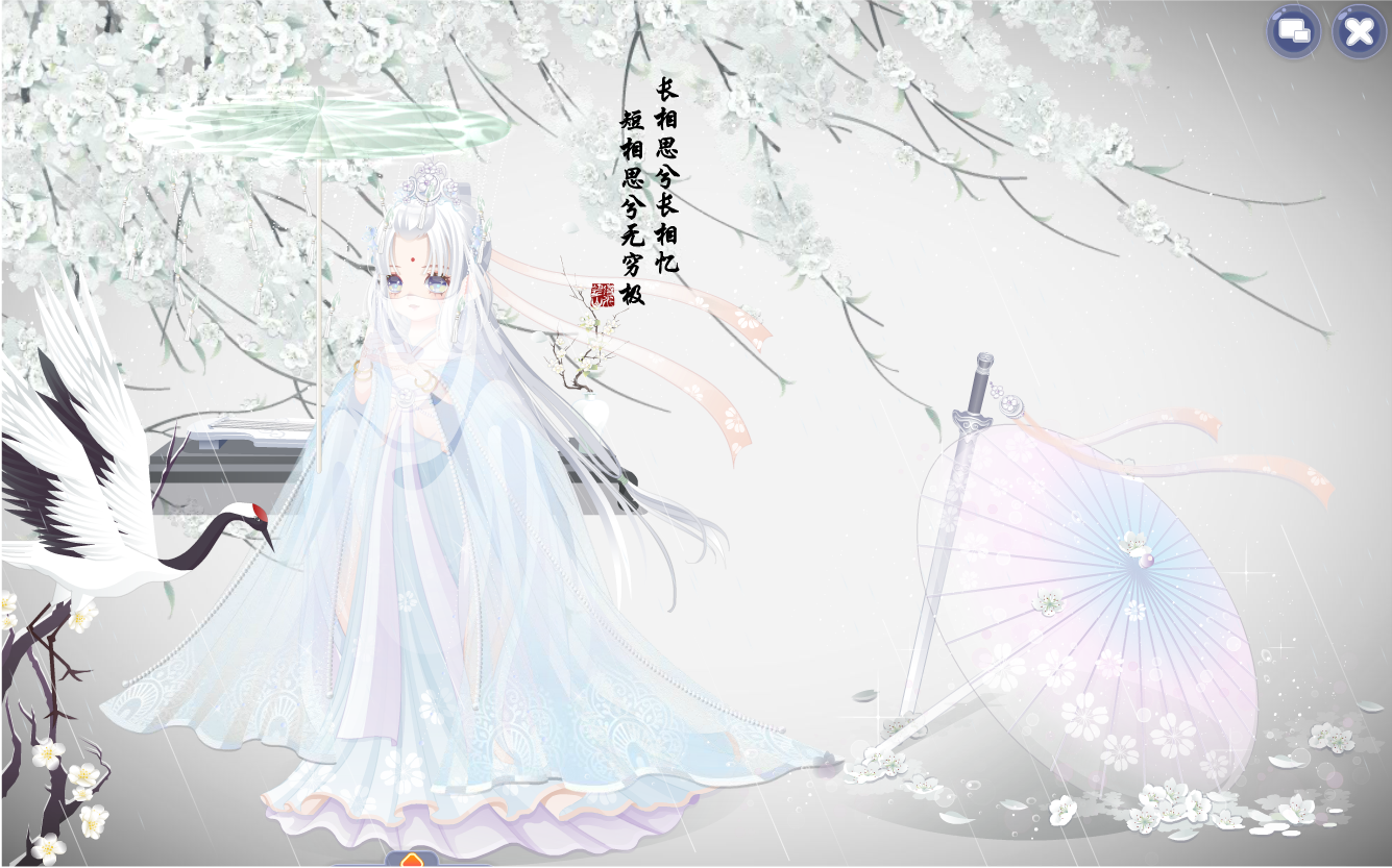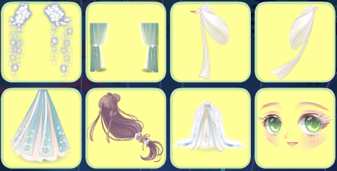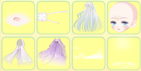 搭配部件:月宫仙子头饰/江山美人帷幔/西子泛舟归左袖/西子泛舟归右袖/寒江孤雪下裙/百鬼镜姬长发/怀春玉兰长裙/幼龙公主可爱妆/枫国新娘花圃/大暑池莲景/江山美人长廊/惊蛰油菜花蜜蜂/清新立春柳叶。