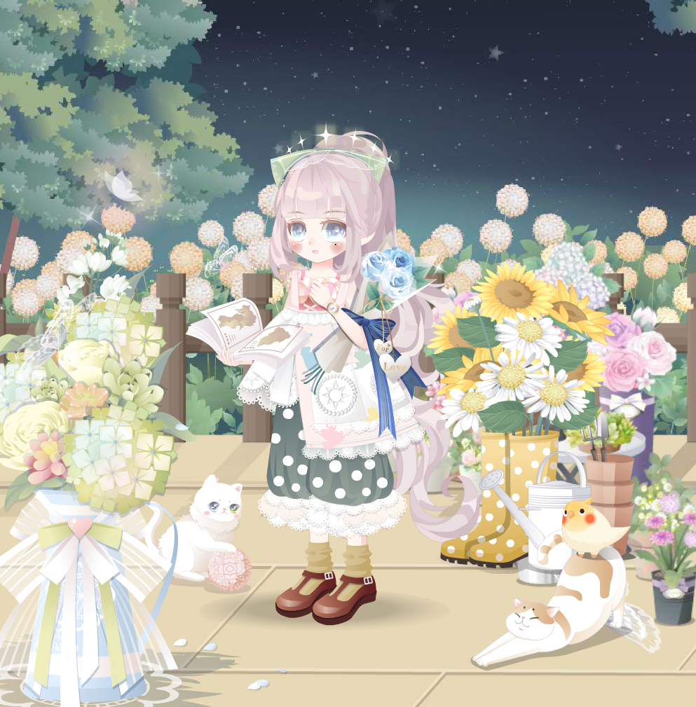 搭配部件:噩梦终端惊讶嘴/永存之爱有爱妆/流行歌手装/森林倾听蝴蝶结/爱琴海新郎花束/美术科代波点裤/美术科代小围裙/精灵呢喃头发/英式新娘光环/地理科代课本/11号饰品/ 睡醒了栏杆/设计间毛毛地毯/设计间待客茶几/设计间待客沙发/波斯忆梦线球猫慵懒冬日背景/园丁小橘猫/花房姑娘左摆花/奇美拉大蝴蝶/浅稚心夜蝴蝶。