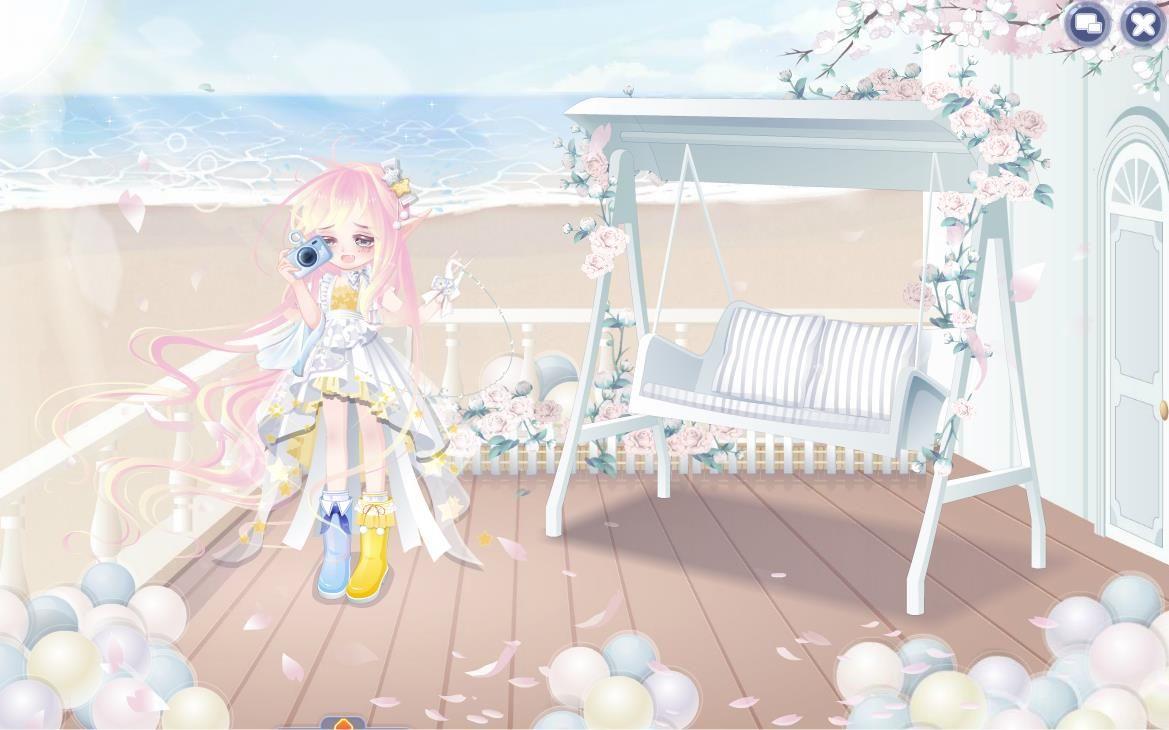搭配部件:不分彼此雨靴、摄梦泡泡相机、永存之爱左手、依赛娜慌张妆、守护天使白裙、探索员星星发夹、洋桔梗黄长发、度假别墅阳台、设计间彩色气球、海适花闲沙滩、寅时破晓阳光、古·千年守候花瓣、今·千金寻爱花瓣。
