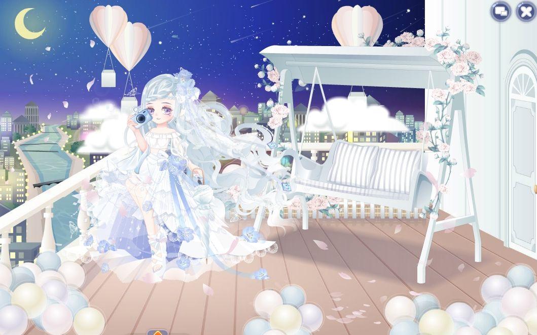 搭配部件:春日甜美纱衣、预言少女妆、摄梦泡泡相机、海适花闲半身裙、海适花闲头纱、欧式贵妇伞、蜕变星天使发、度假别墅阳台、设计间热气球、设计间彩色气球、古·千年守护花瓣、流星浪漫夜景